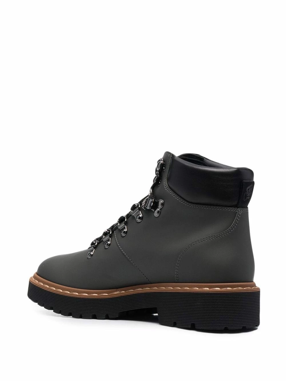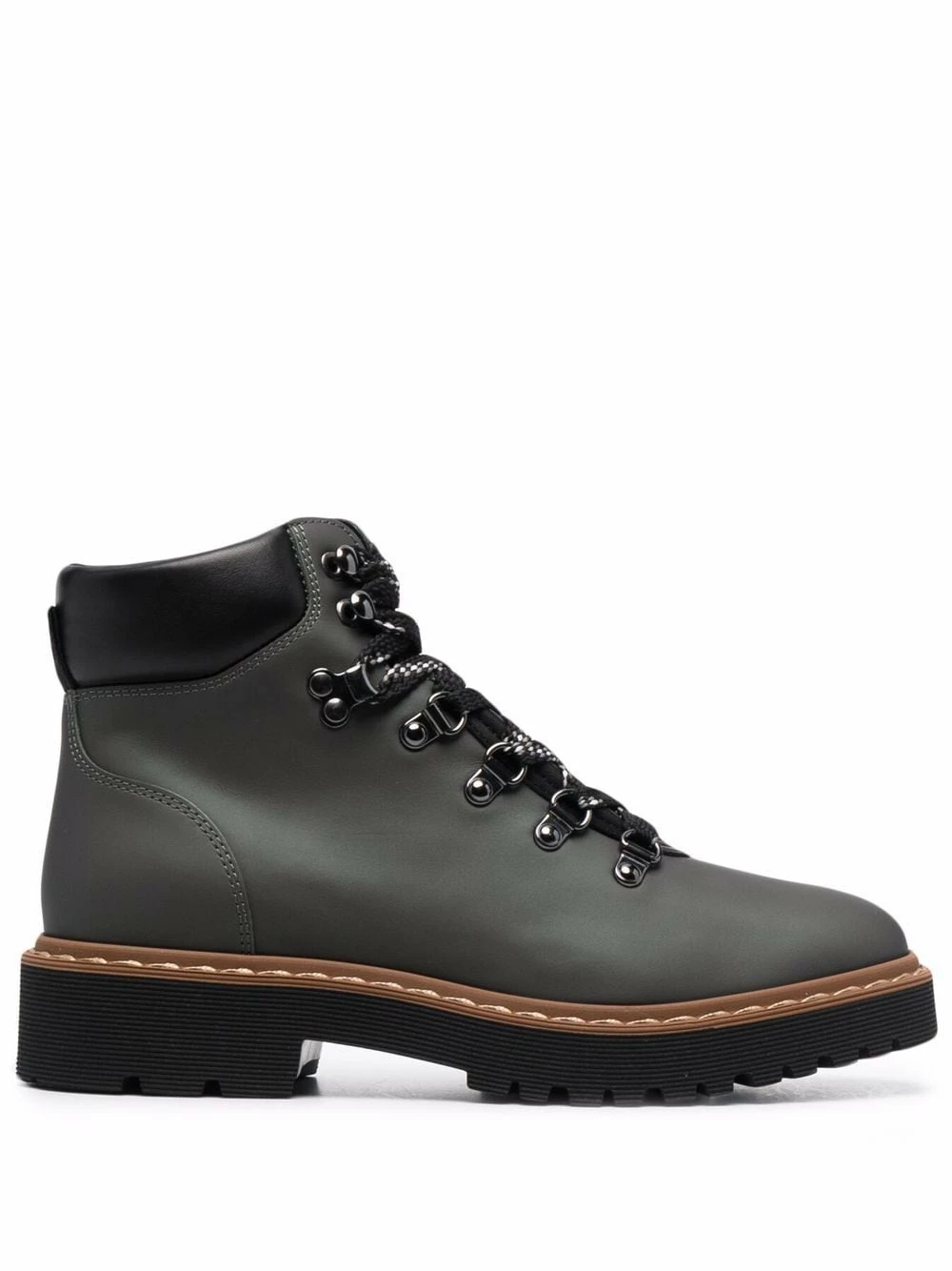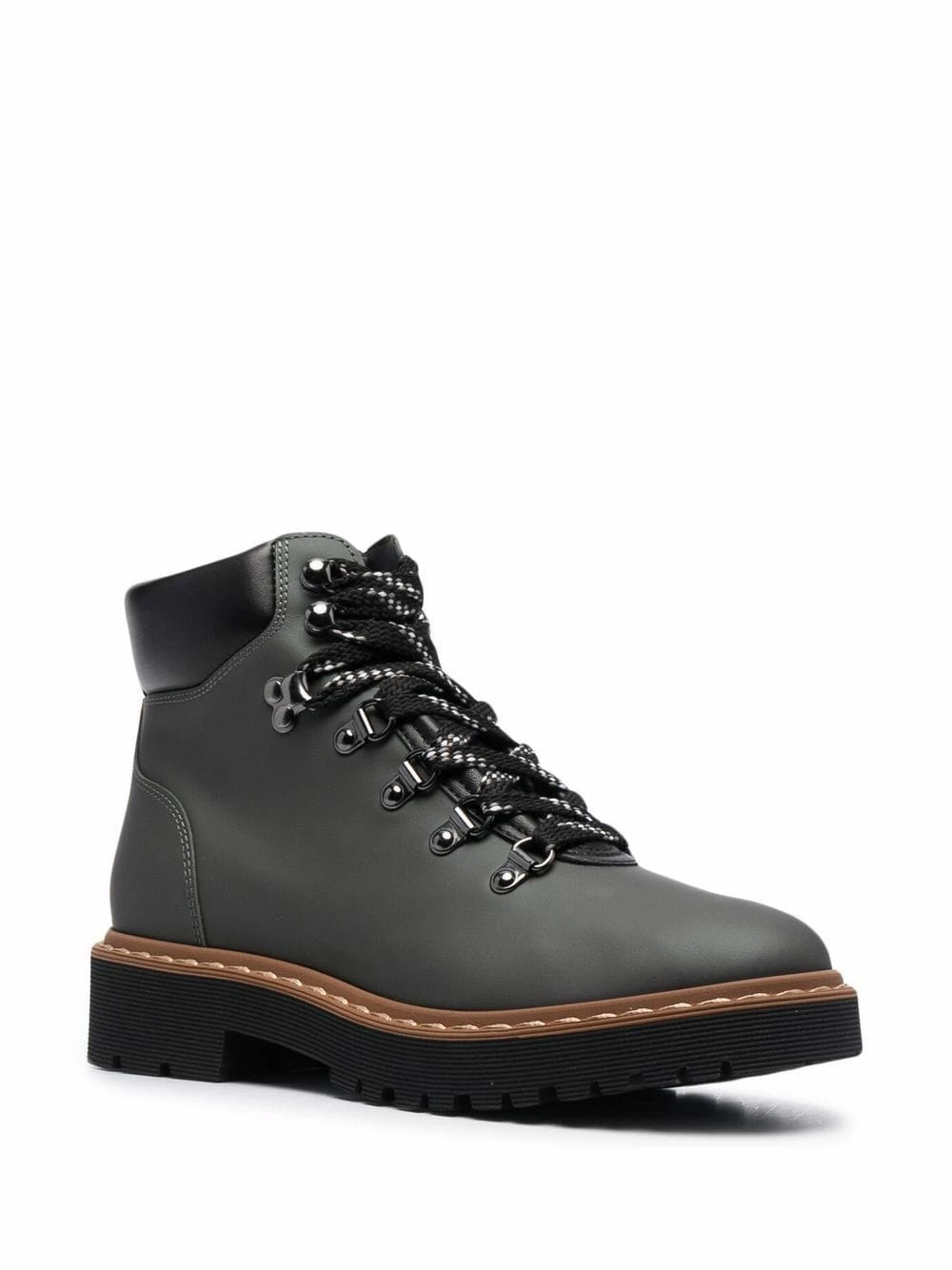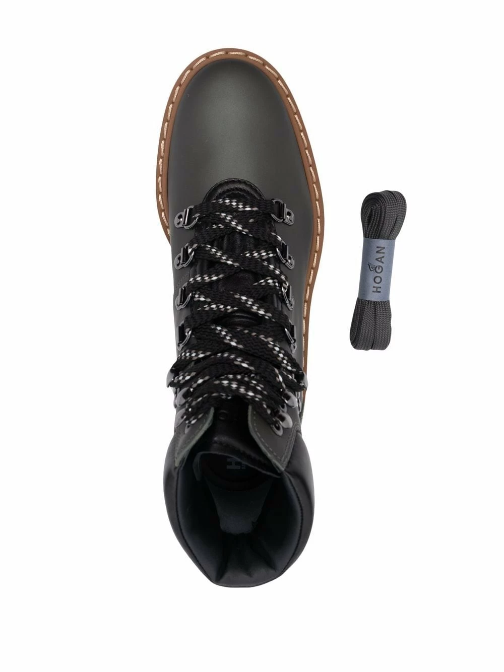 Coutures contrastantes, bout rond, fermeture à lacer sur le devant, chevilles rembourrées, petit talon épais, semelle crantée en caoutchouc. Couleur : noir. Matière : cuir de veau.