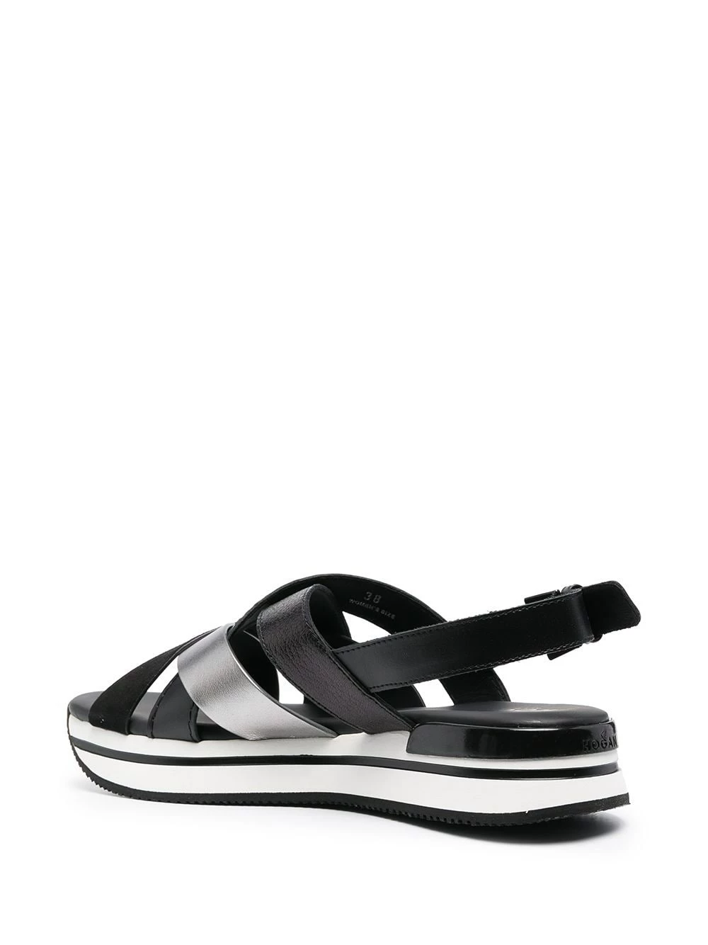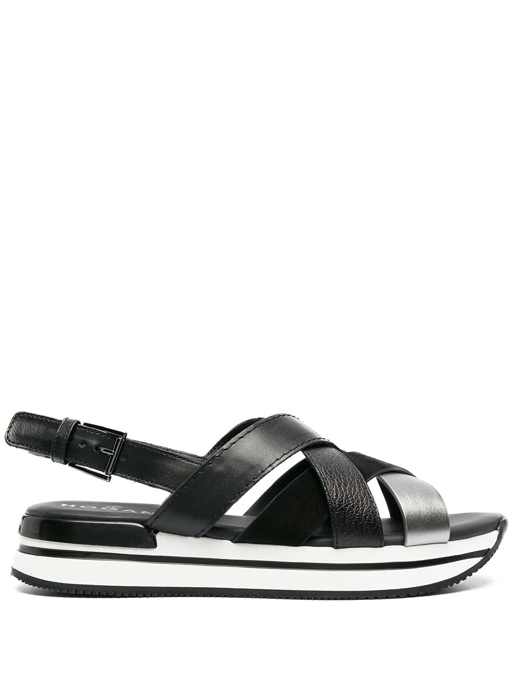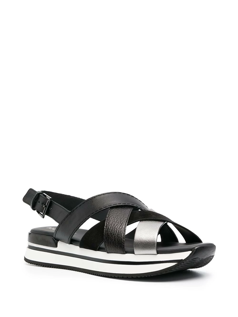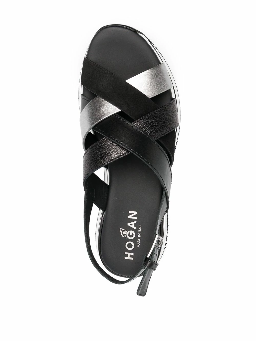 Détail de brides croisées, semelle intérieure à logo, bout ouvert, talon compensé, bride cheville à boucle, semelle crantée en caoutchouc. Matière : cuir.