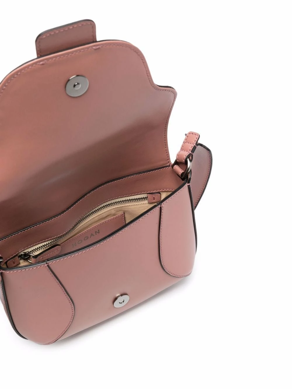 Logo imprimé sur le devant, détails de découpes, coutures ton sur ton, bride porté épaule ajustable, rabat sur le dessus à fermeture magnétique, compartiment principal, poche intérieure zippée. Matière : cuir.