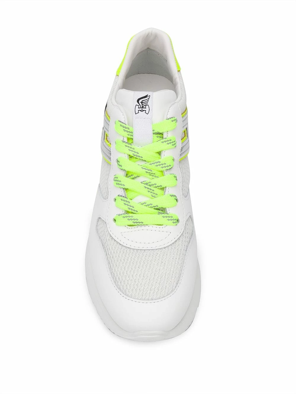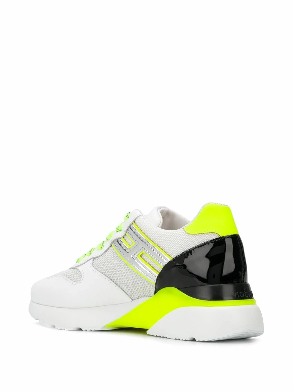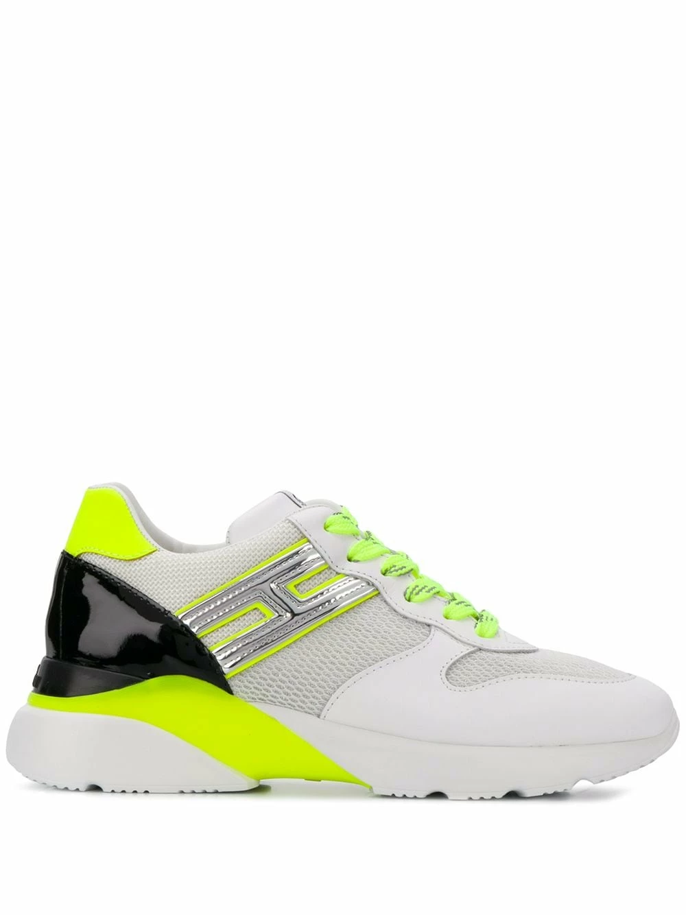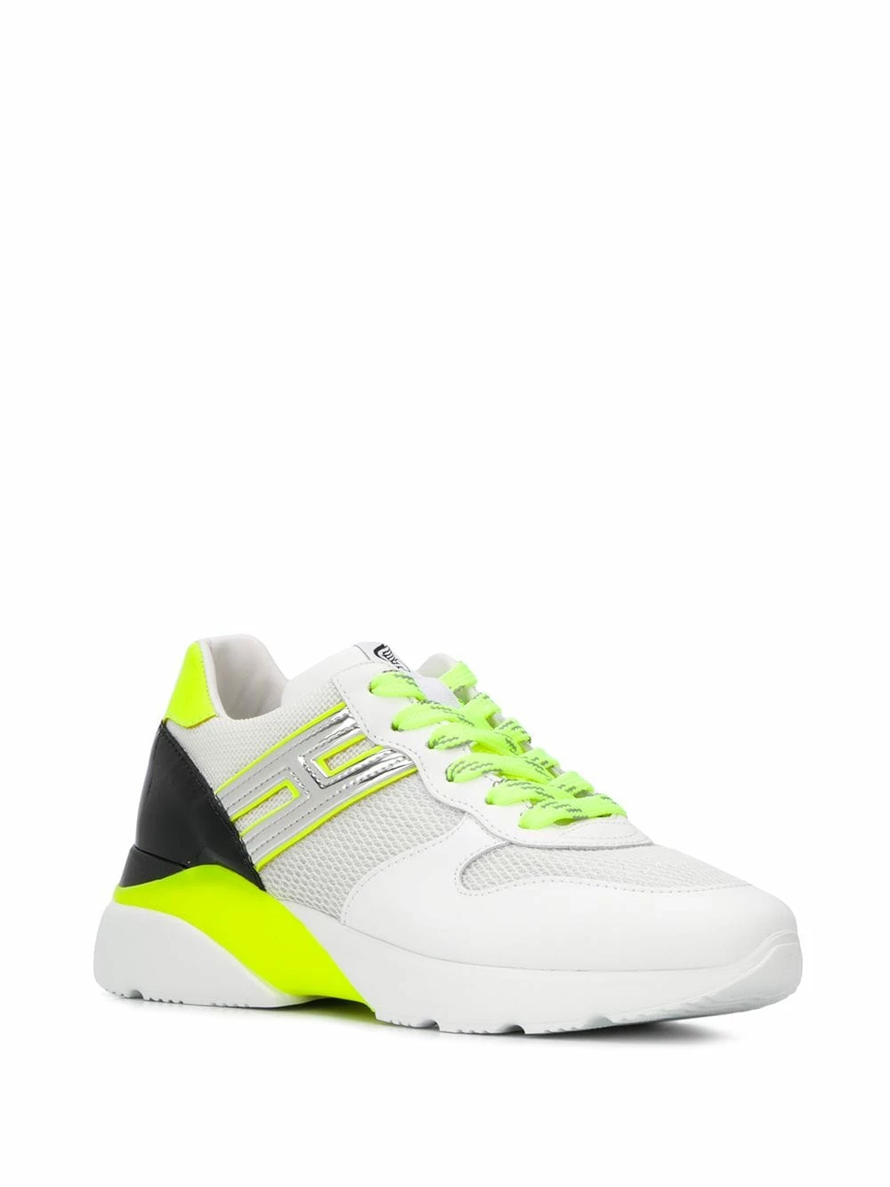 Baskets à patch logo en cuir Hogan avec bout rond, empiècements en résille, fermeture à lacer sur le devant et patch logo sur la languette. Couleur: blanc.
