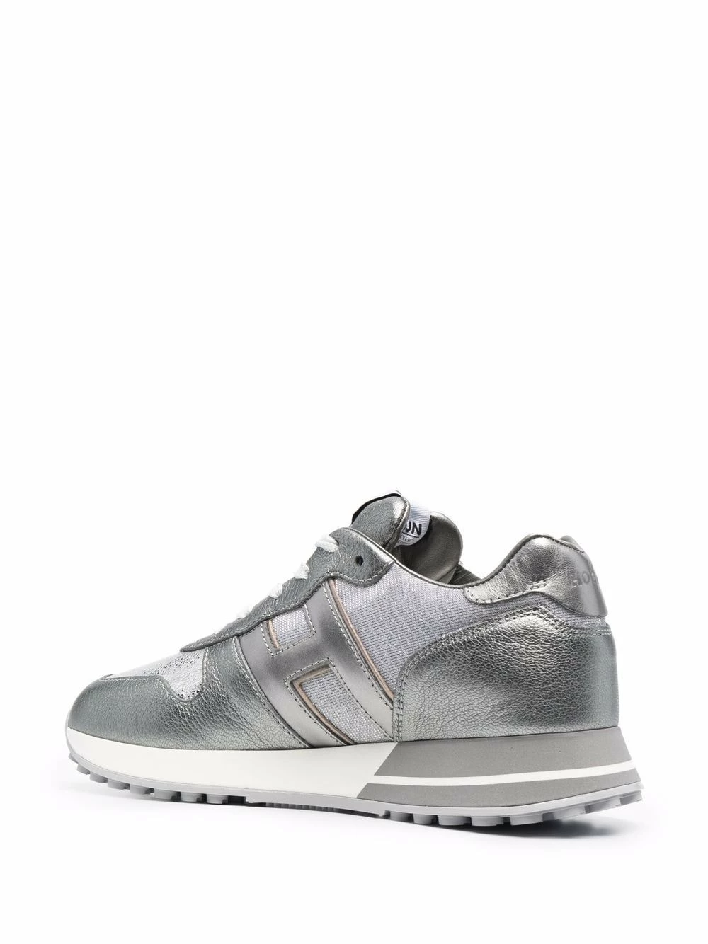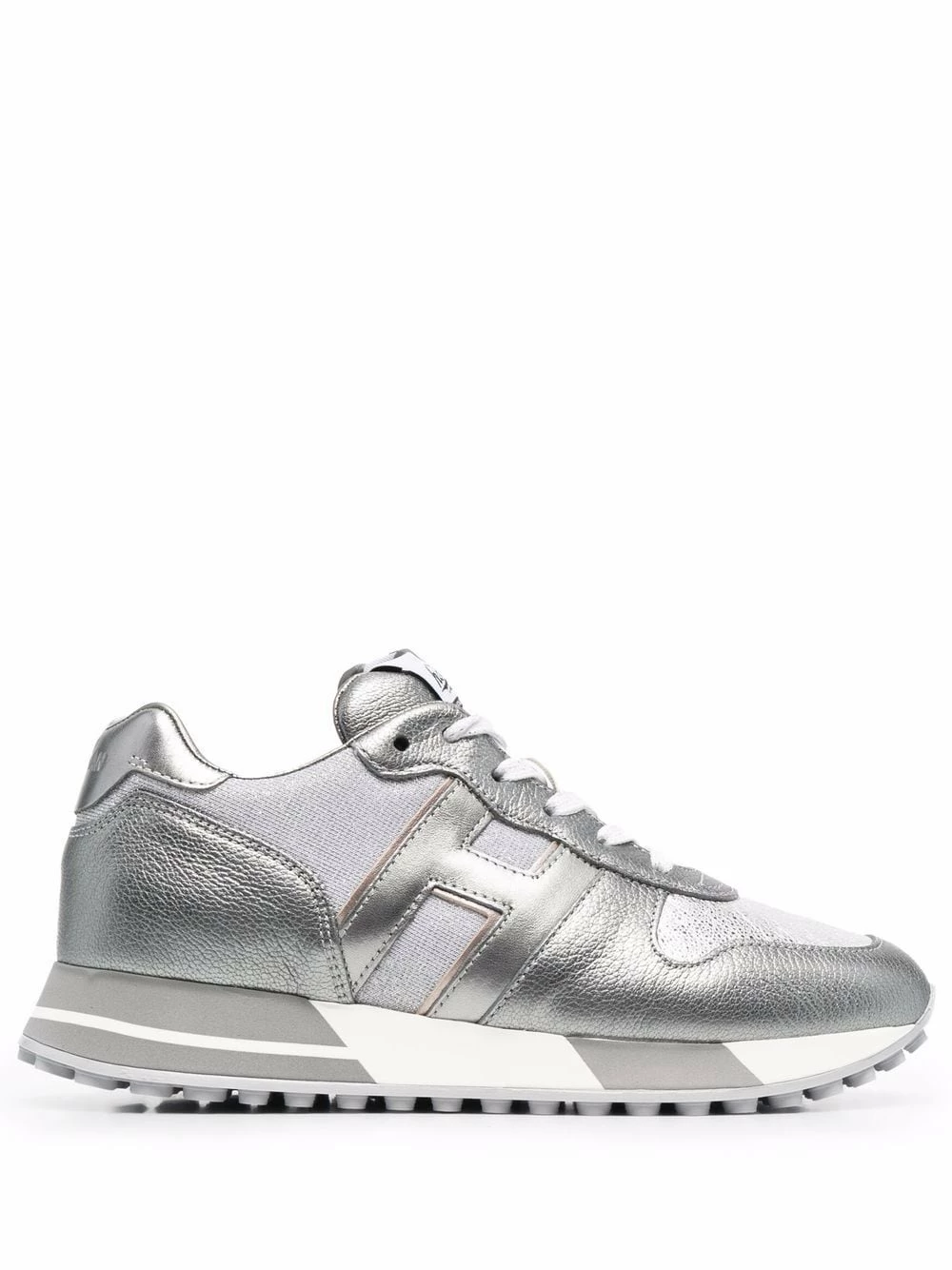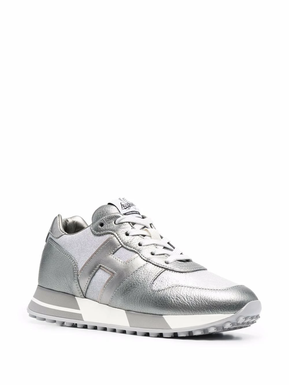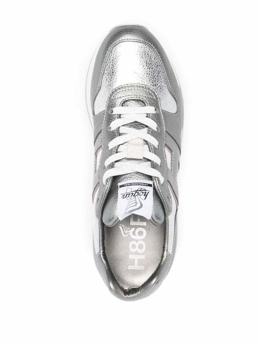 Fermeture à lacer sur le devant, semelle plate en caoutchouc, fini métallisé, patch logo sur le côté. Couleur : argent. Matière : cuir.