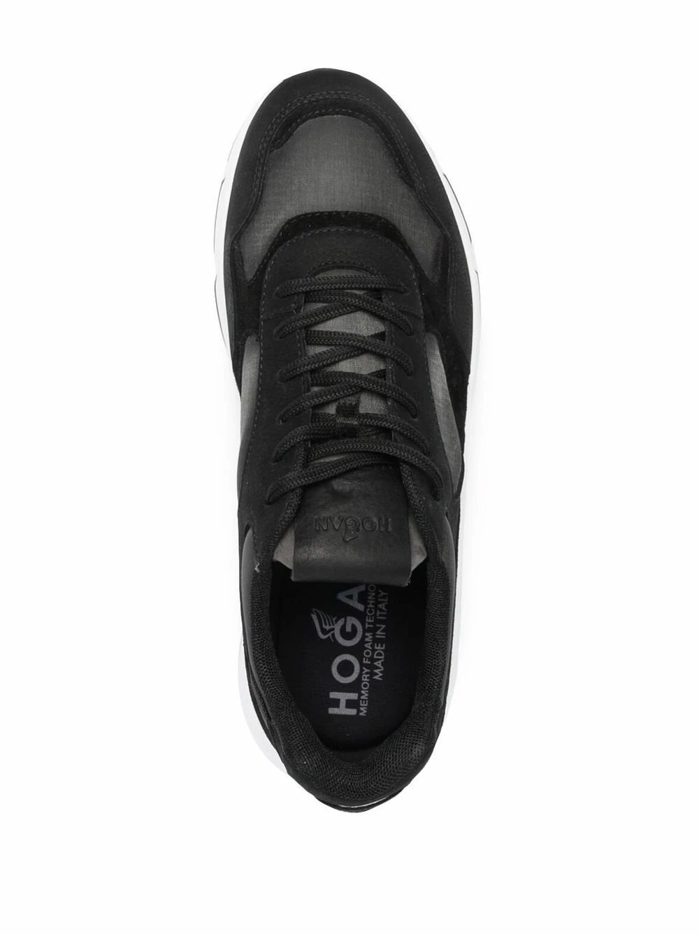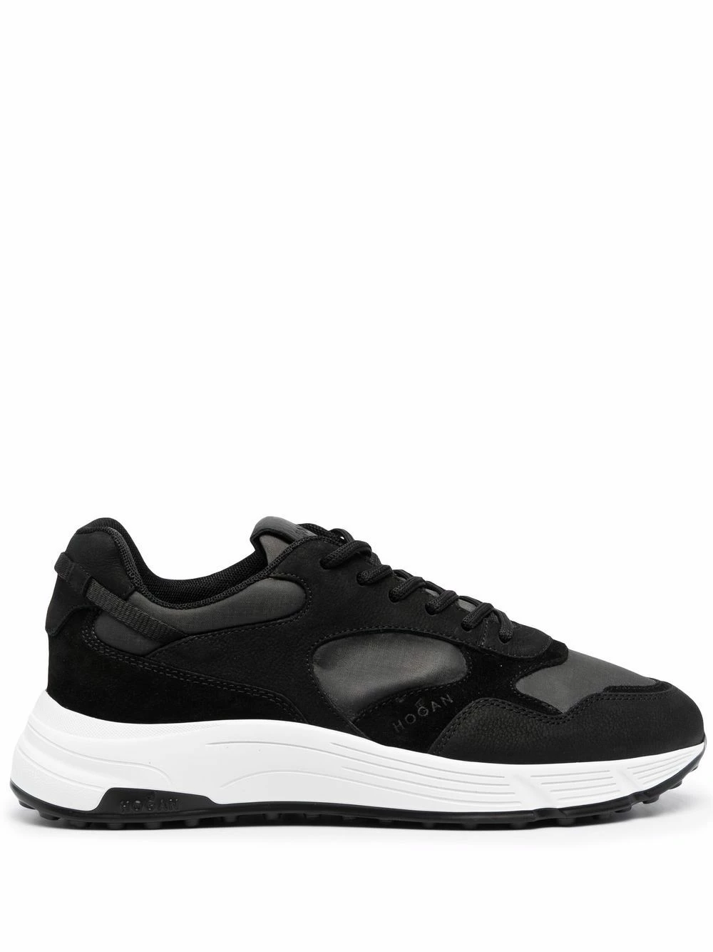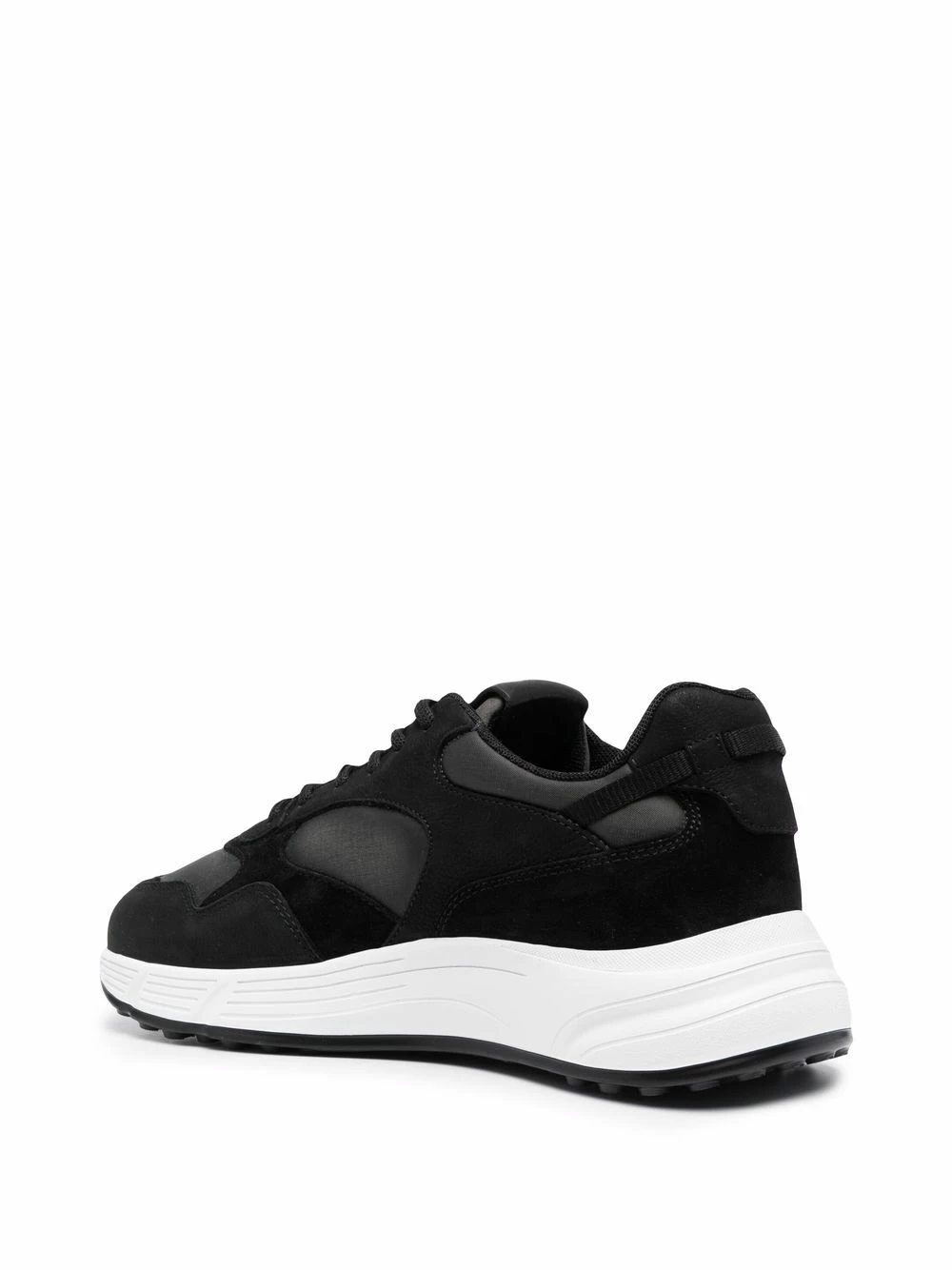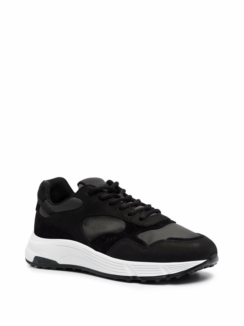 Design à empiècements, languette à logo embossé, bout rond, fermeture à lacer sur le devant, semelle contrastante en caoutchouc. Couleur : noir. Matière : cuir.