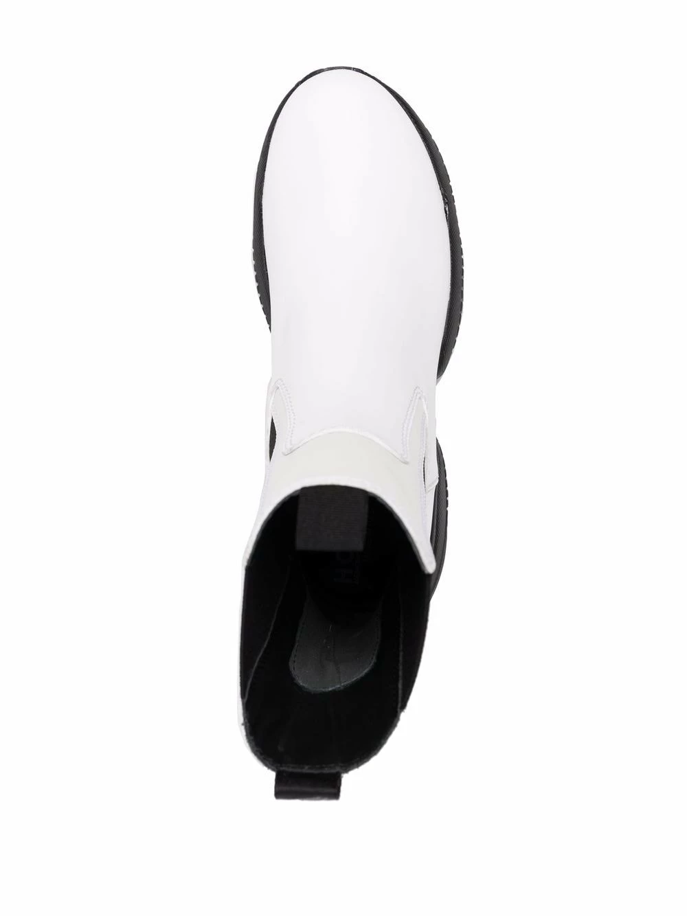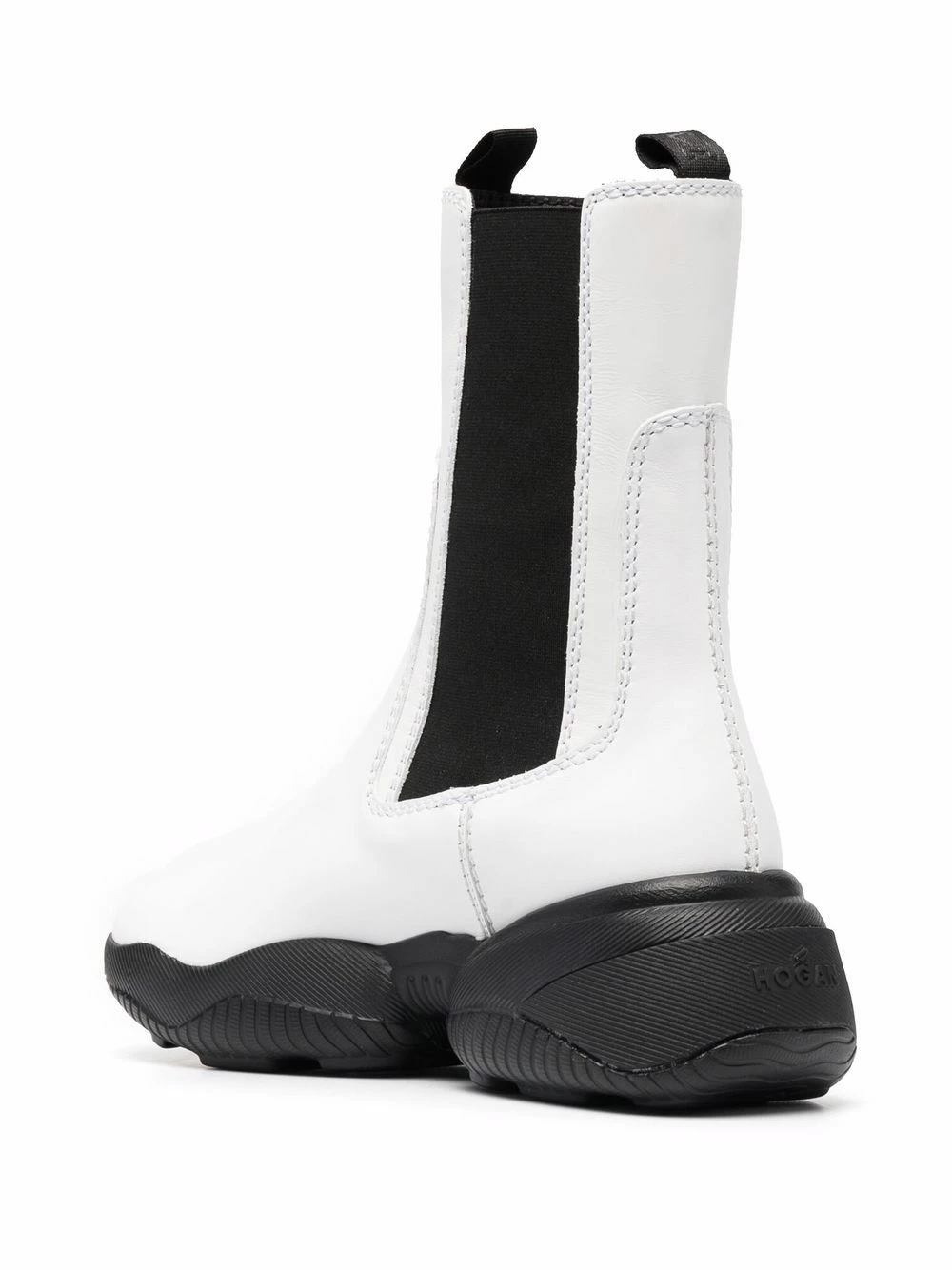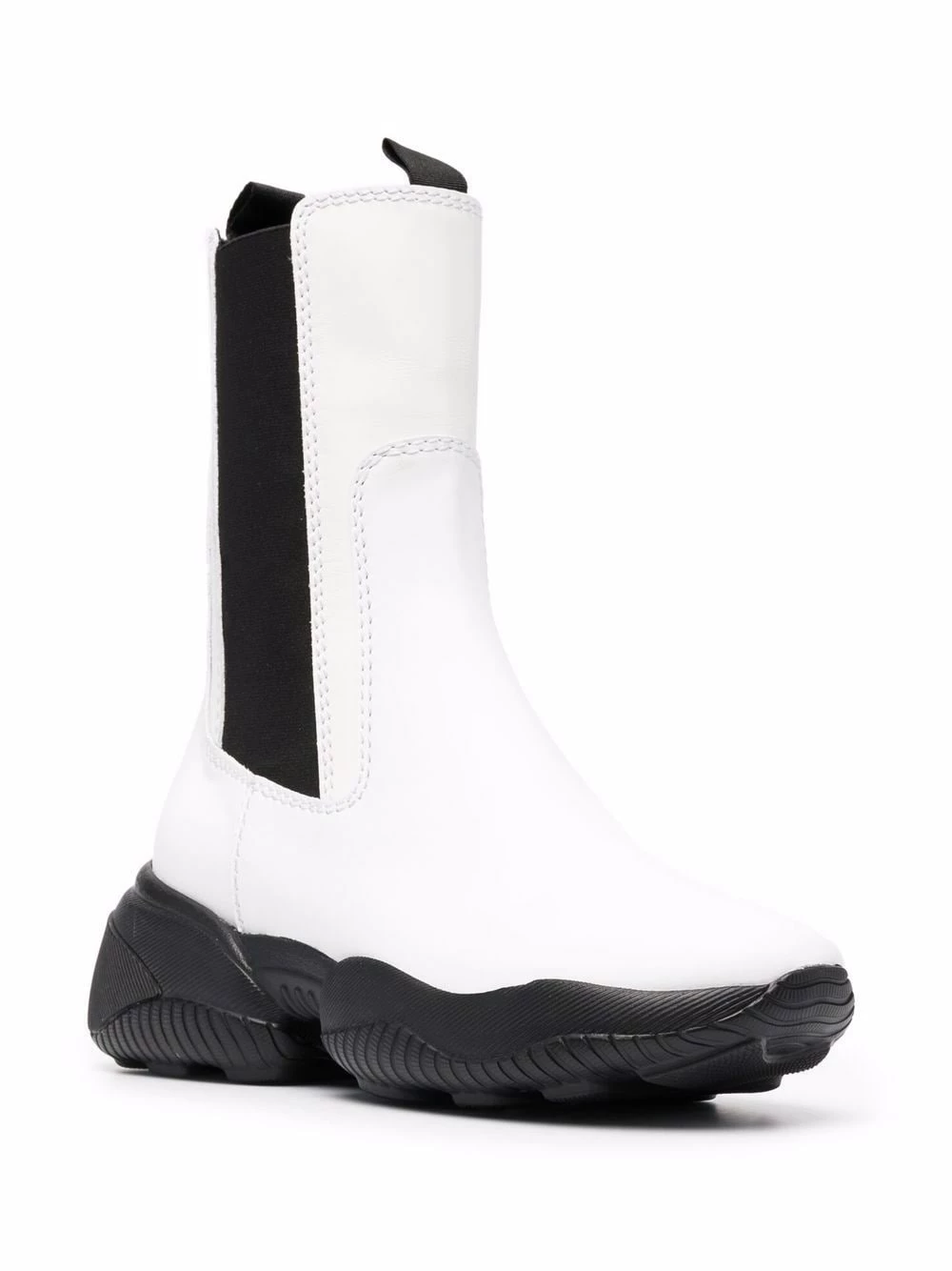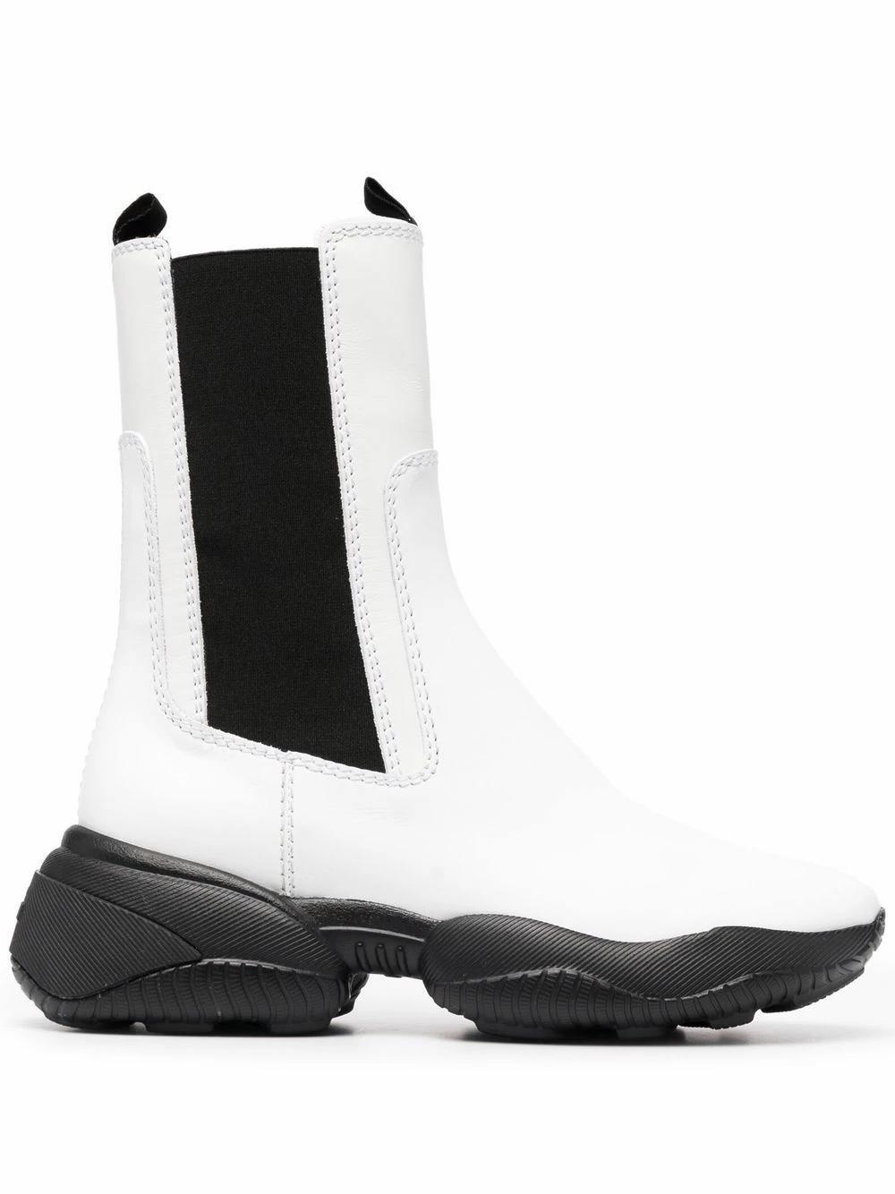 Modèle bicolore, bout rond, empiècements élastiqués sur les côtés, ouverture à double languette, semelle épaisse en caoutchouc. Matière : cuir.