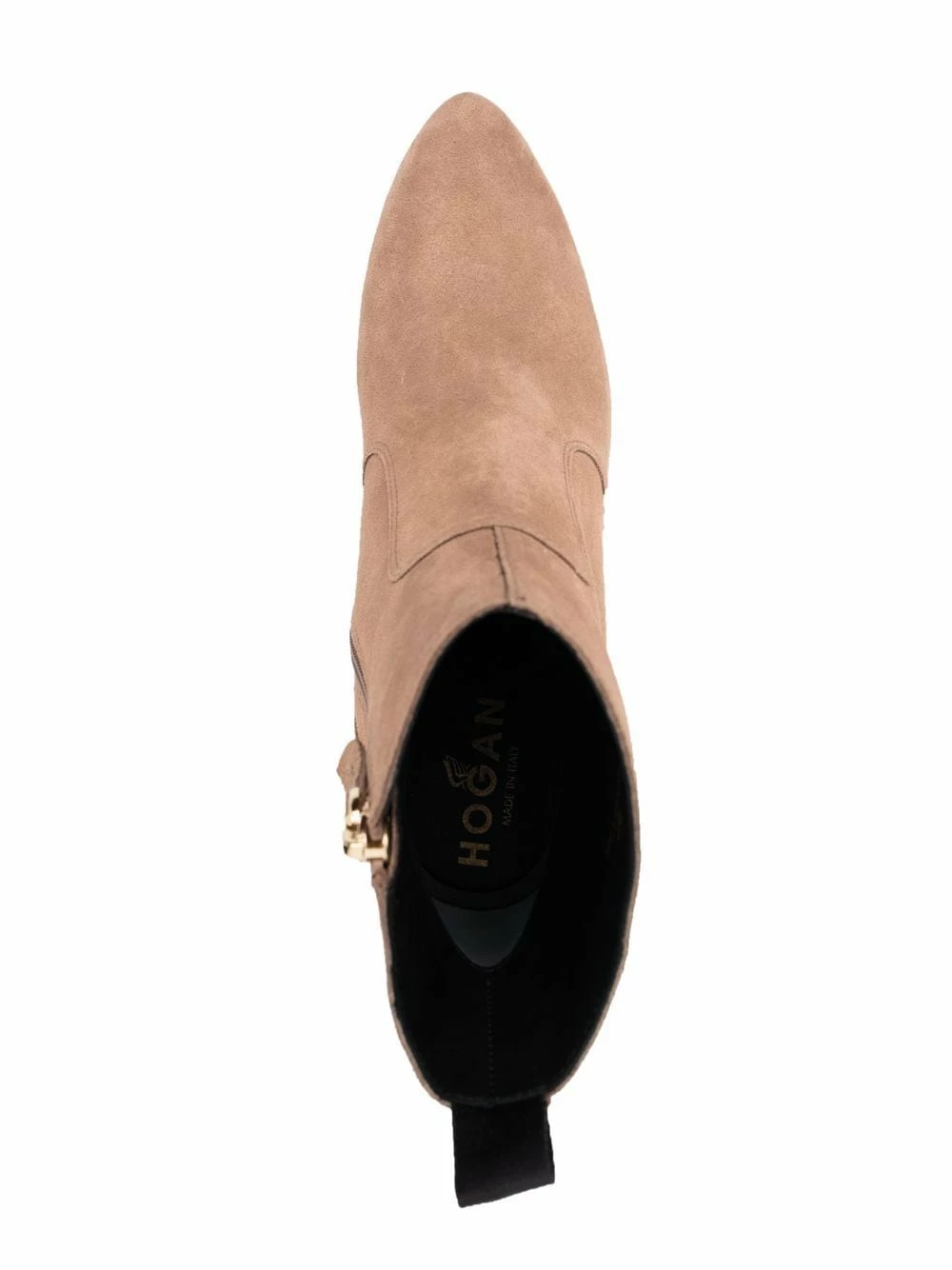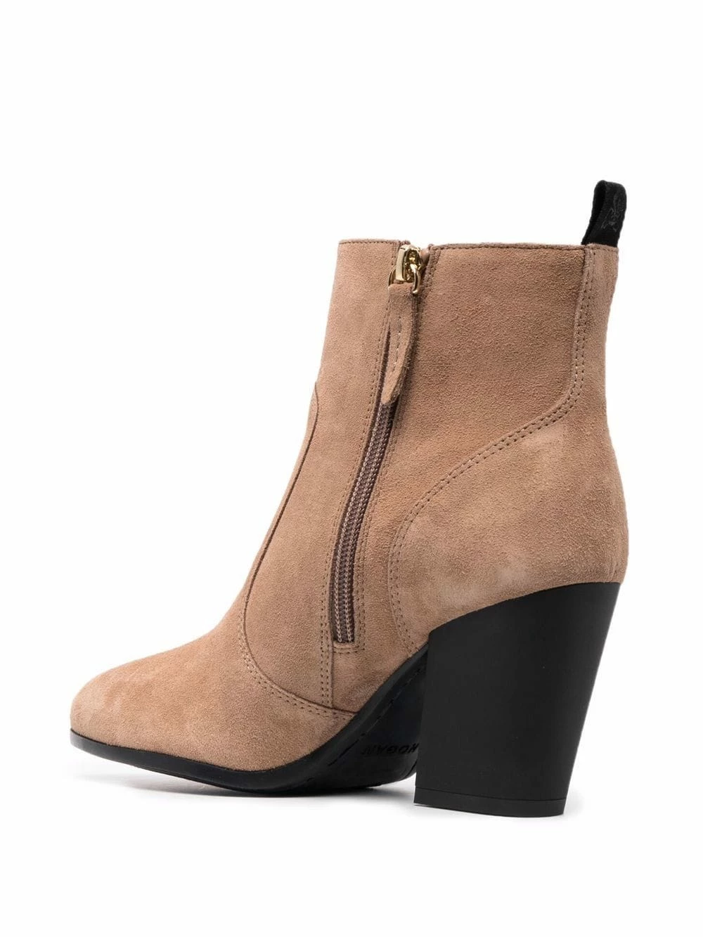 Bout pointu, coutures ton sur ton, languette d’enfilage au talon, fermeture zippée sur le côté, semelle intérieure en mousse à mémoire de forme, semelle intérieure à logo, semelle extérieure en caoutchouc, talon mi-haut épais. Matière : cuir.