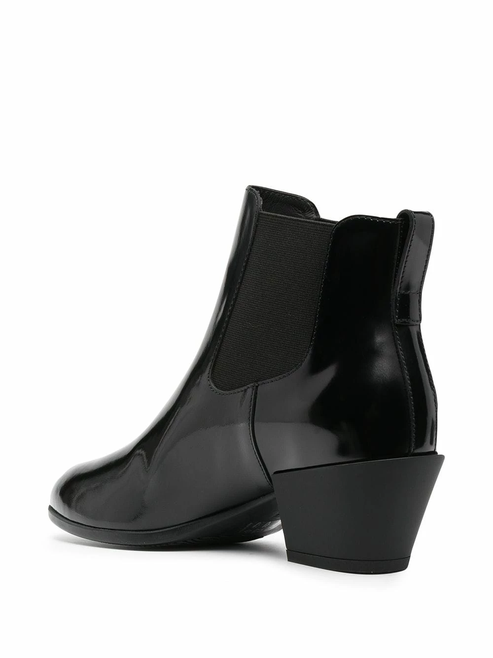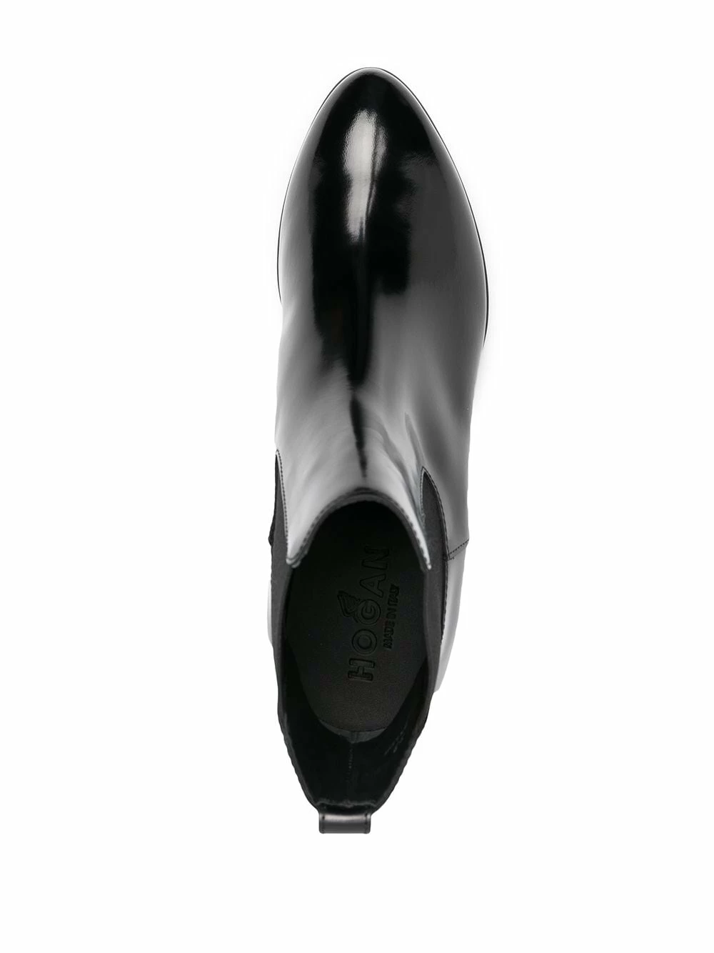 Bout pointu, empiècements élastiqués sur les côtés, petit talon, longueur cheville. Couleur : noir. Matière : cuir.