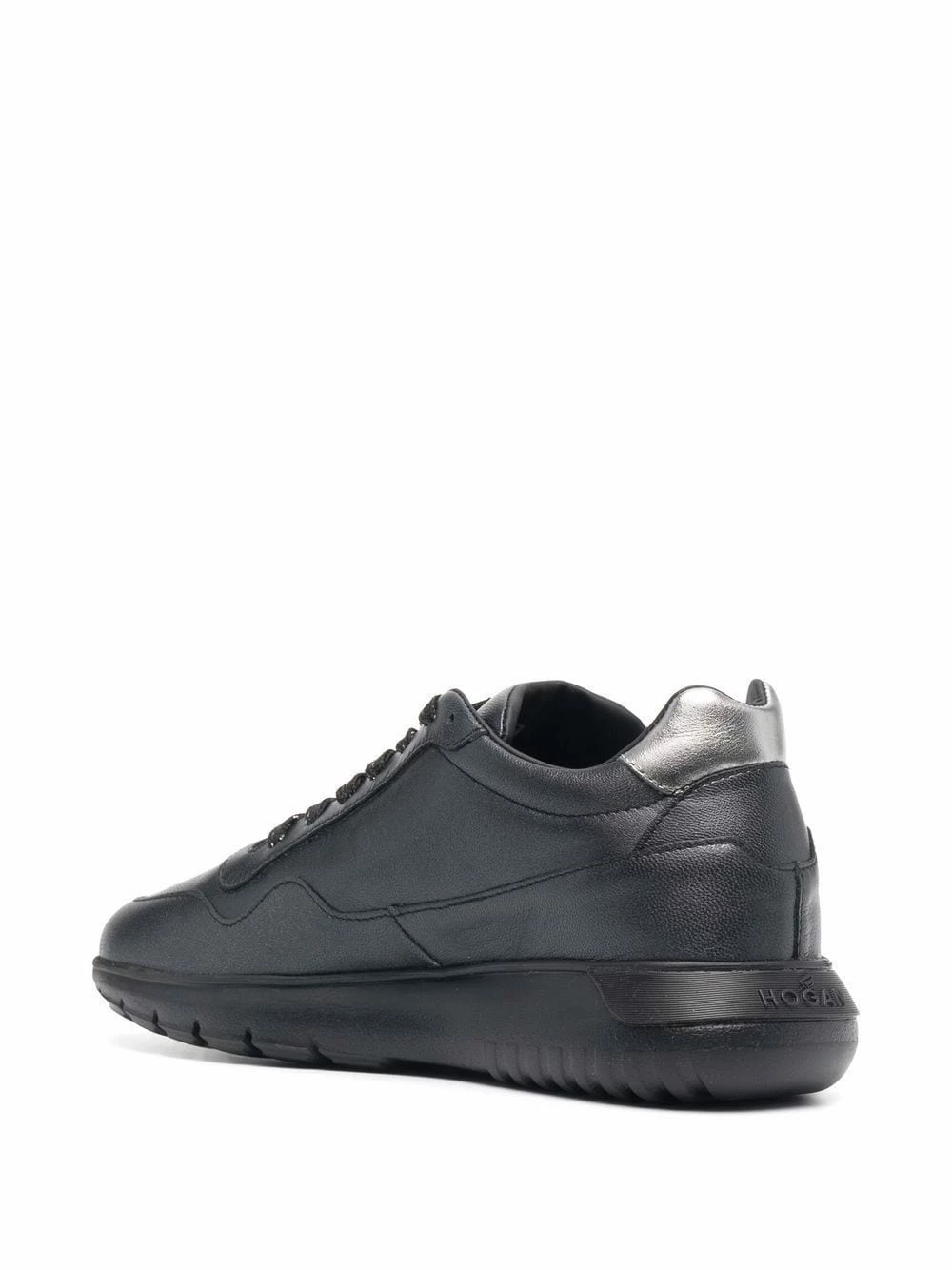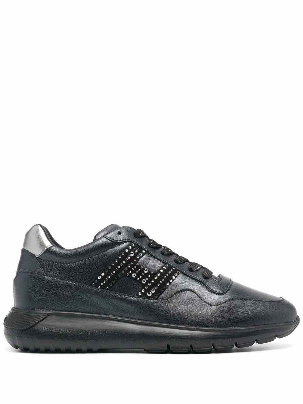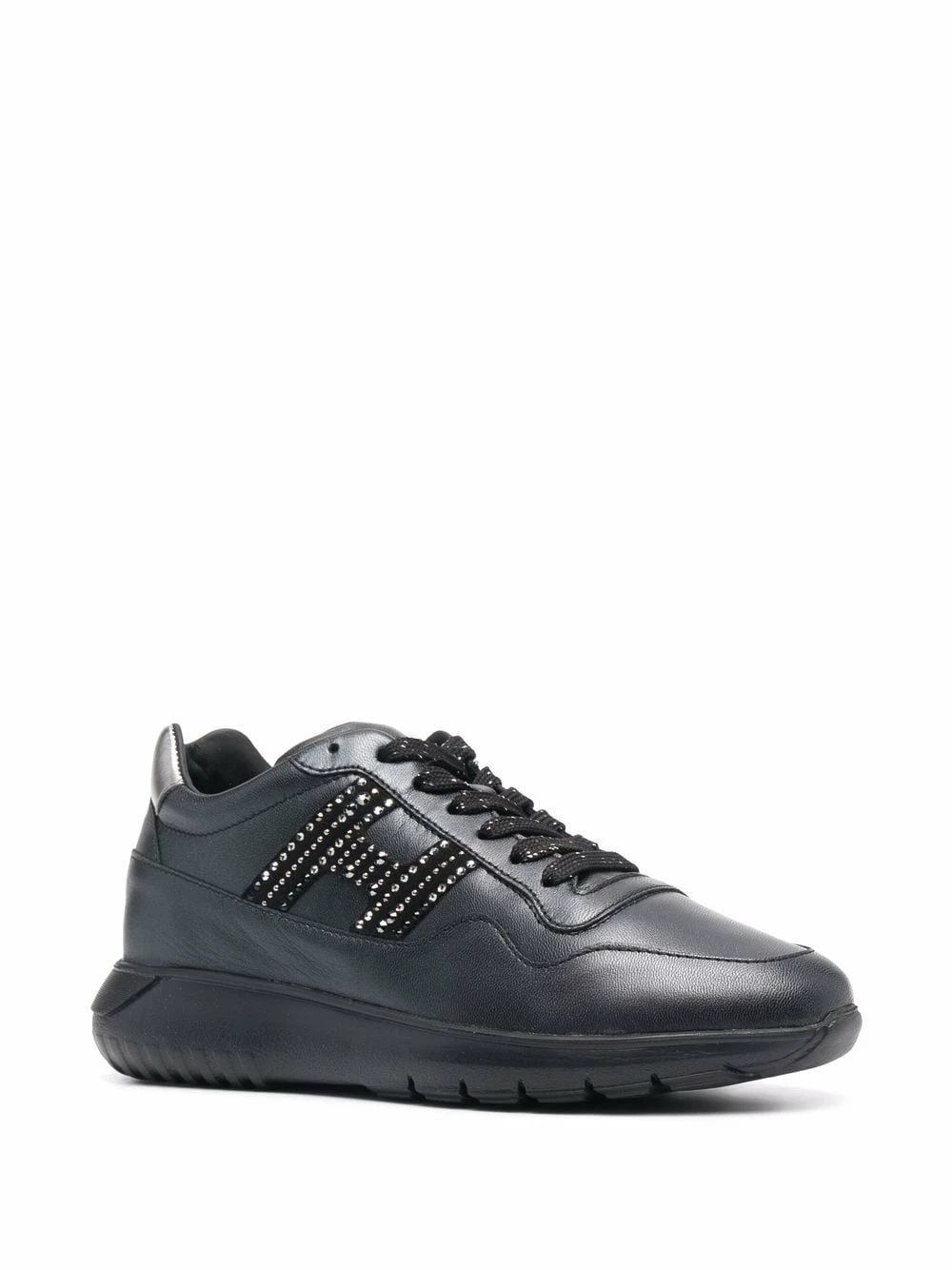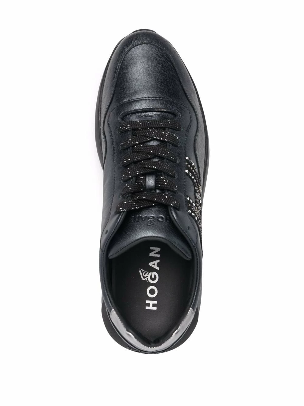 Patch logo sur le côté, ornement en cristal, bout rond, fermeture à lacer sur le devant, languette à logo embossé, semelle intérieure à logo, contrefort contrastant, semelle plate en caoutchouc. Couleur : noir. Matière : cuir.
