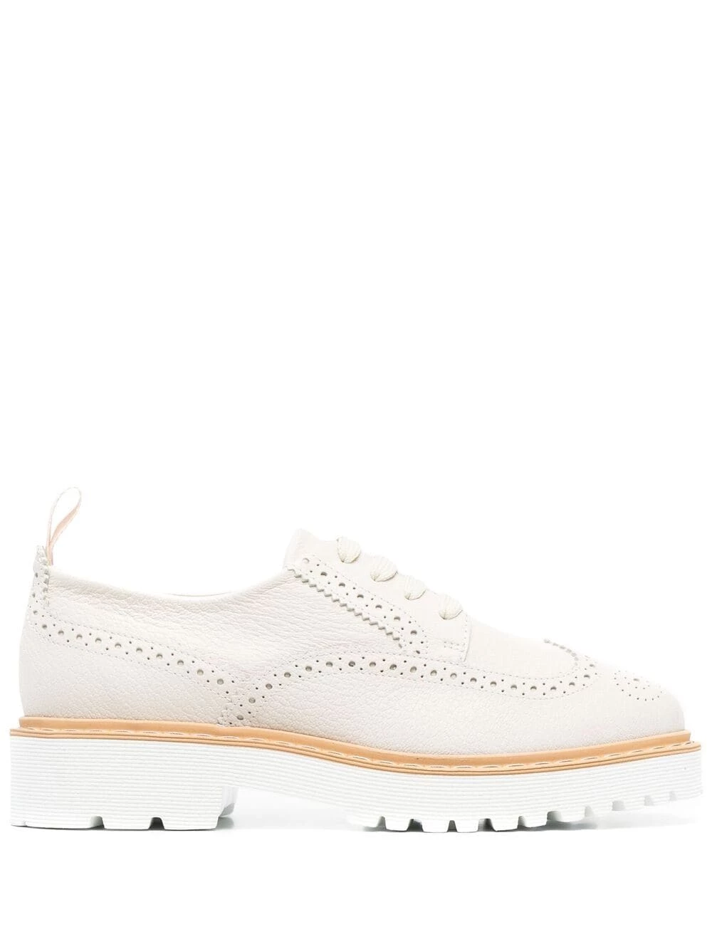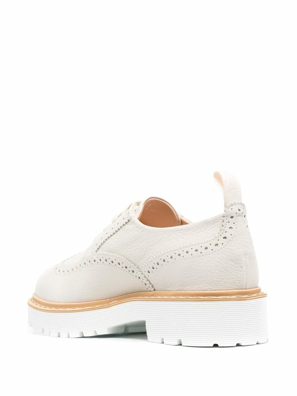 Détails de perforation, fermeture à lacer sur le devant, bout rond, semelle plate.