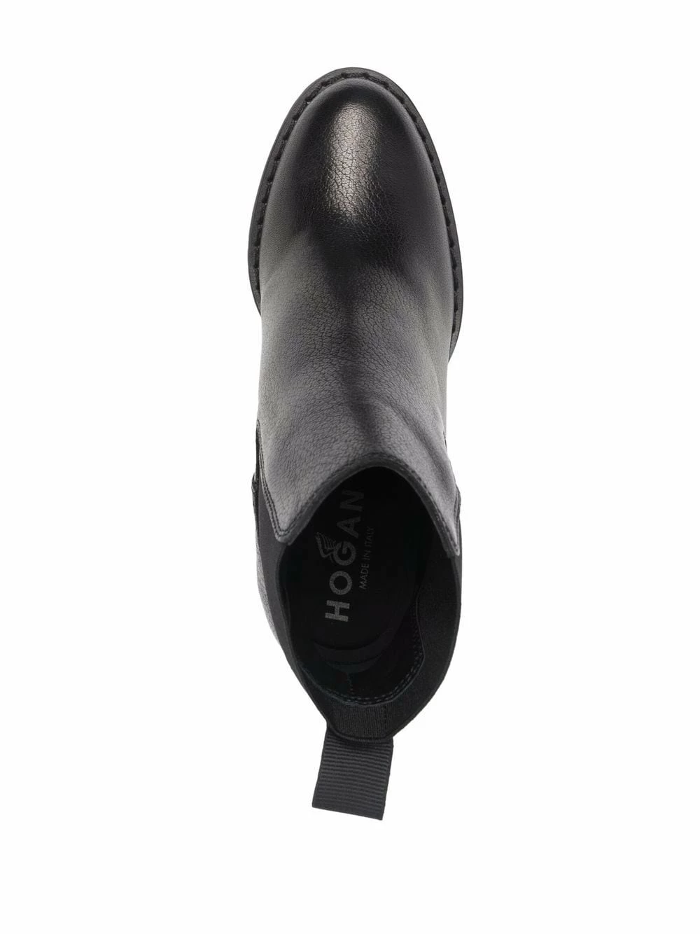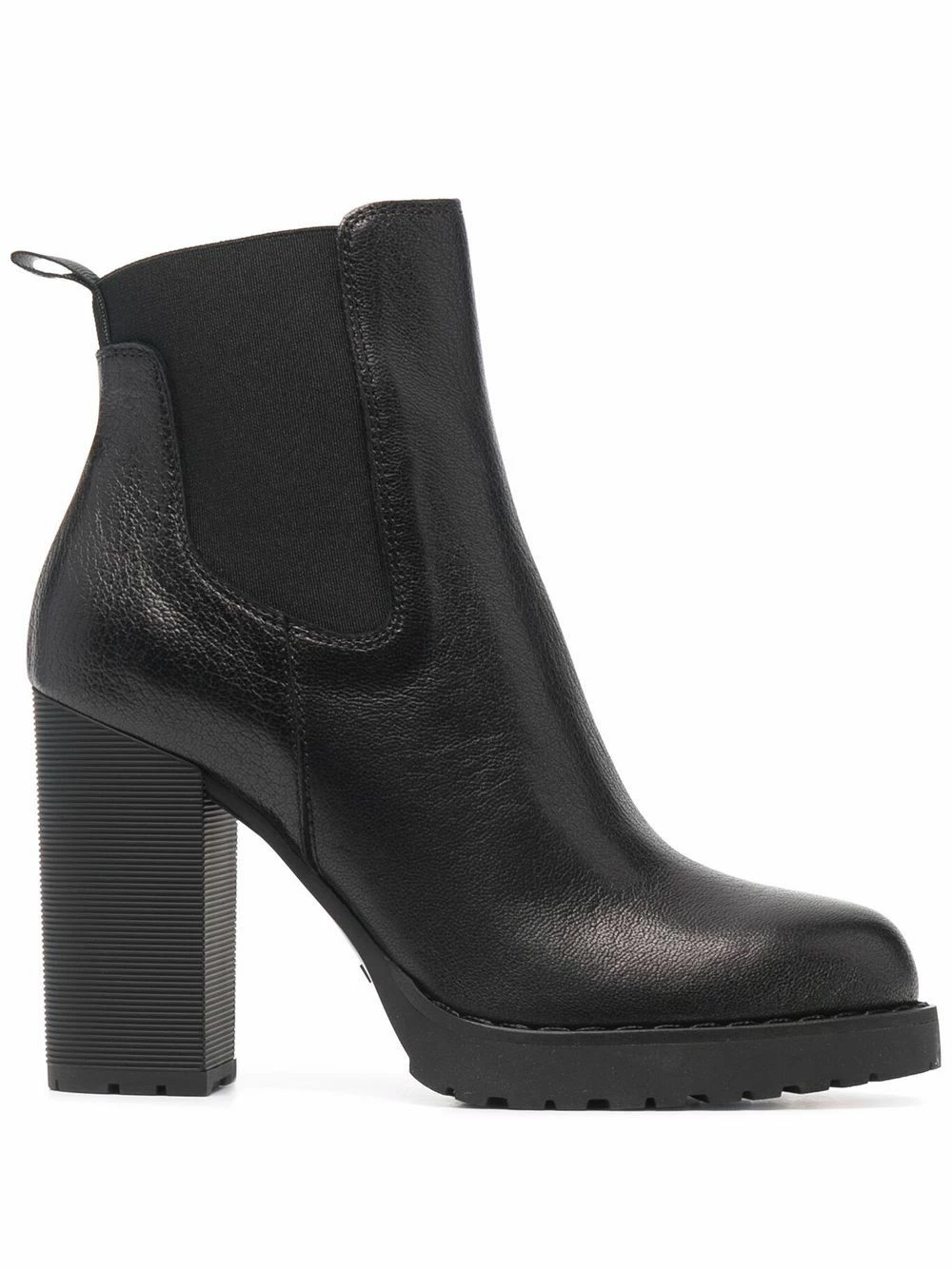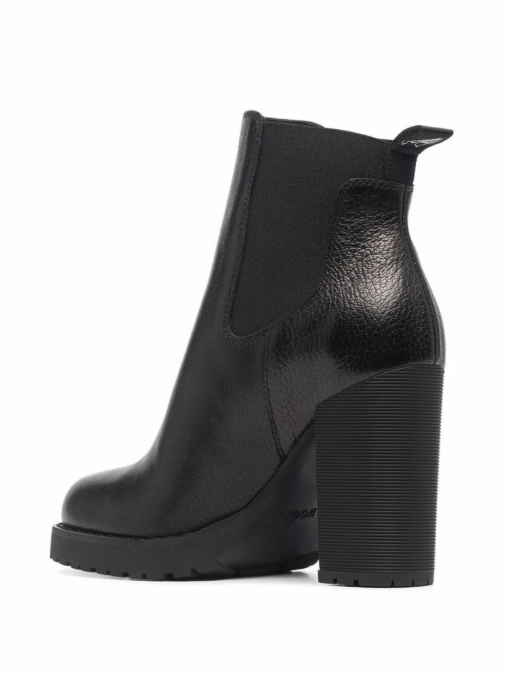 Bout rond, empiècements élastiqués sur les côtés, semelle intérieure à logo, languette d’enfilage au talon, talon haut, semelle crantée en caoutchouc. Couleur : noir. Matière : cuir.