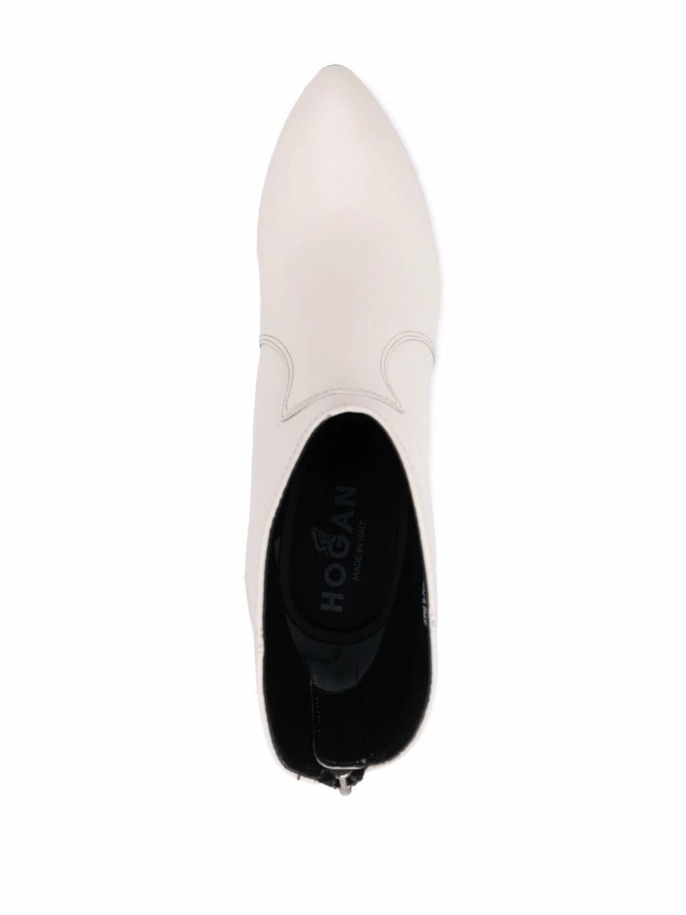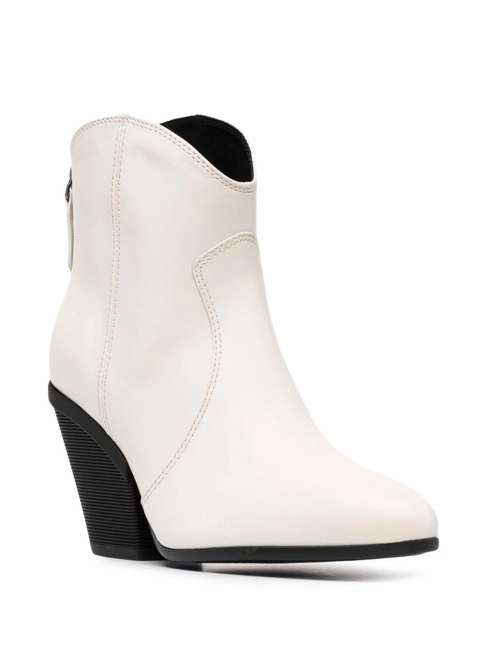 Bout pointu, fermeture zippée à l’arrière, hauteur cheville, talon haut épais. Couleur : blanc. Matière : cuir.