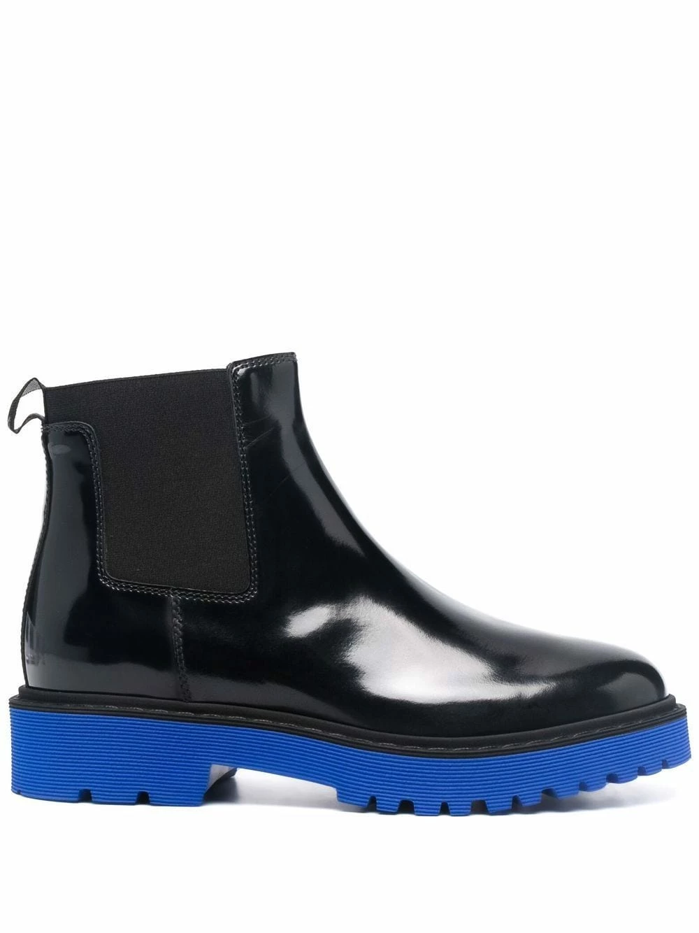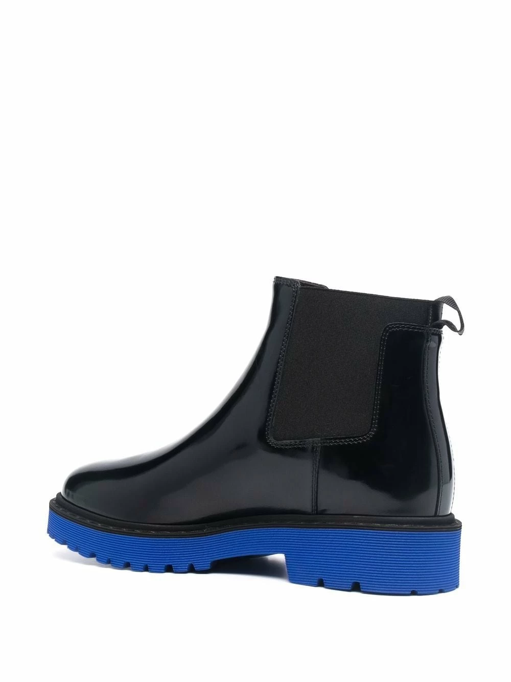 Bout en amande, empiècements élastiqués sur les côtés, semelle intérieure à logo, languette d’enfilage au talon, petit talon, semelle crantée en caoutchouc, hauteur cheville. Matière : cuir.
