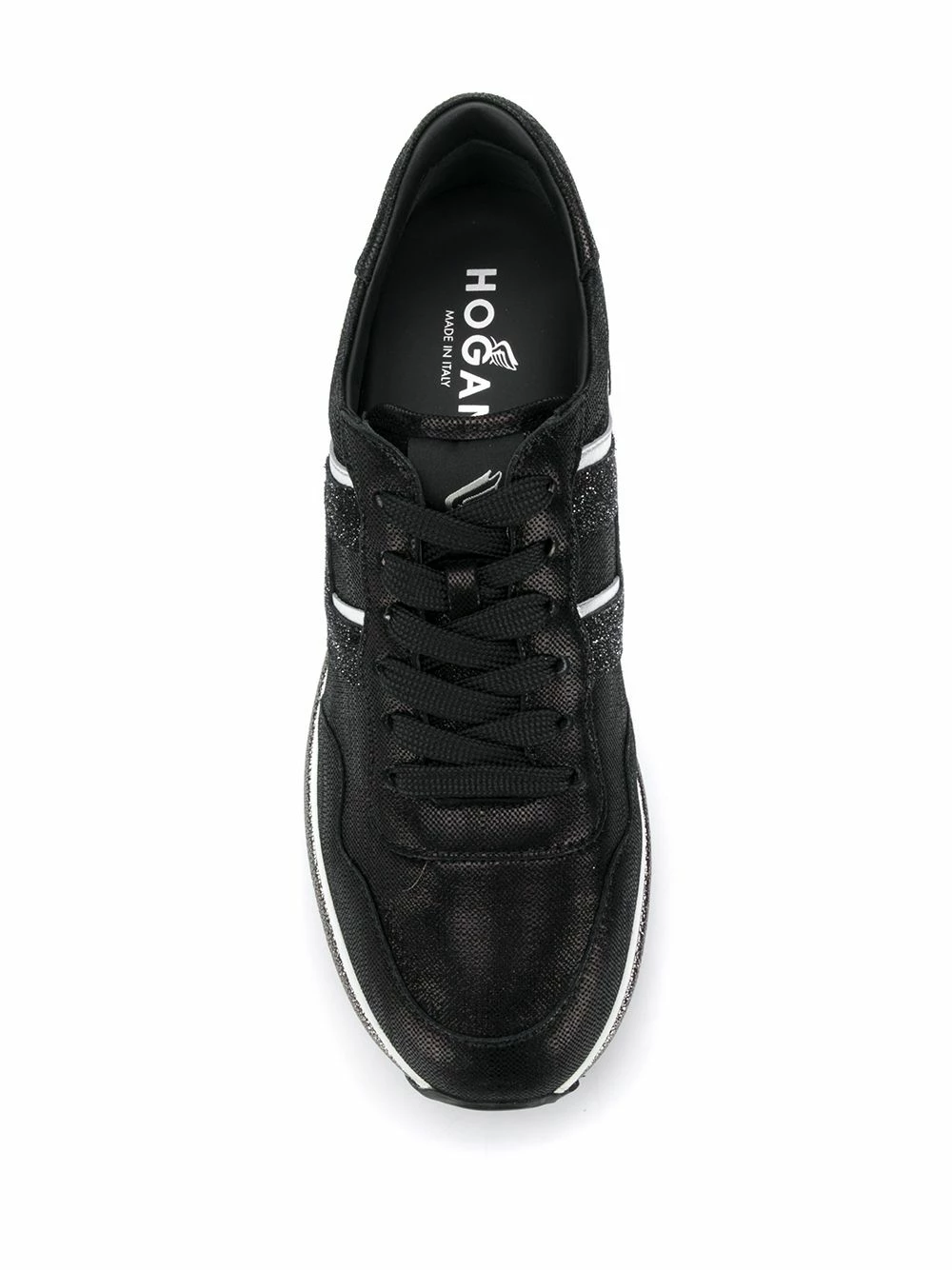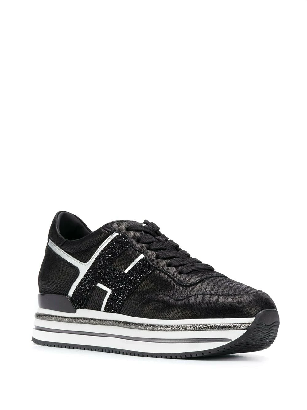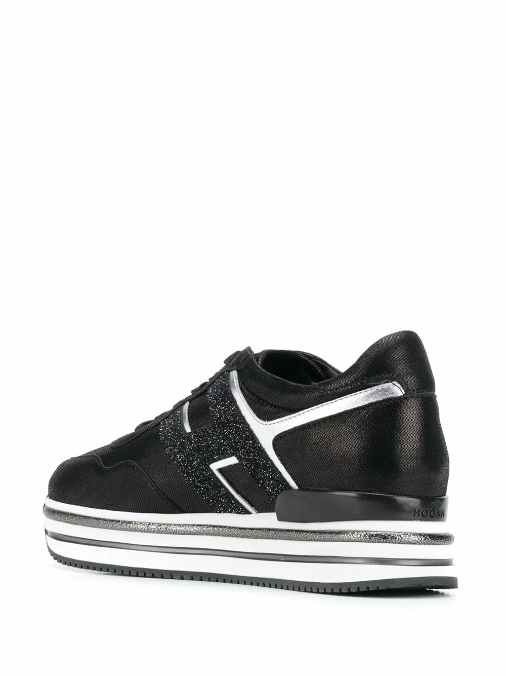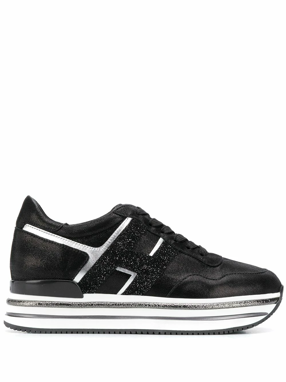 Baskets à plateforme en cuir Hogan avec logo sur le devant et le côté, détails de paillettes, semelle à plateforme, bout rond, fermeture à lacer sur le devant et semelle intérieure à logo. Couleur : noir.