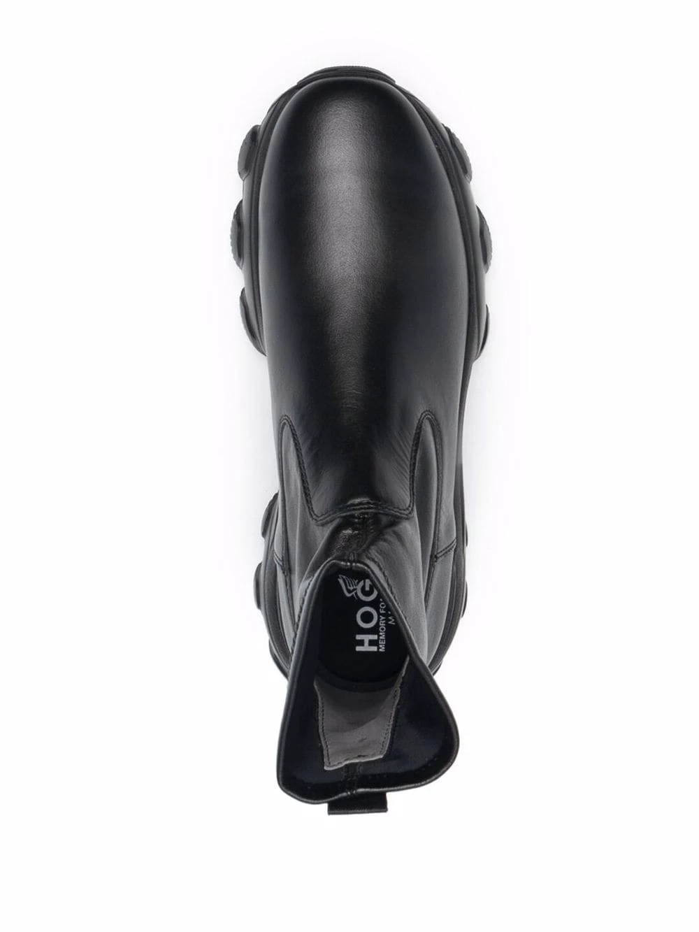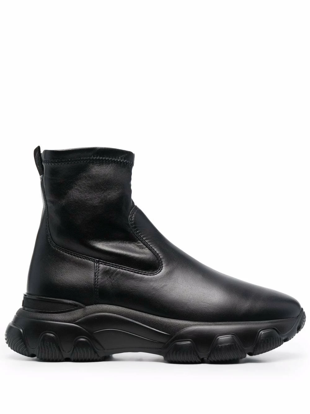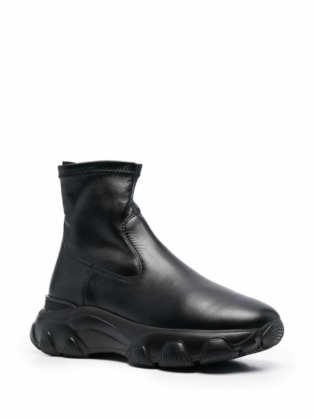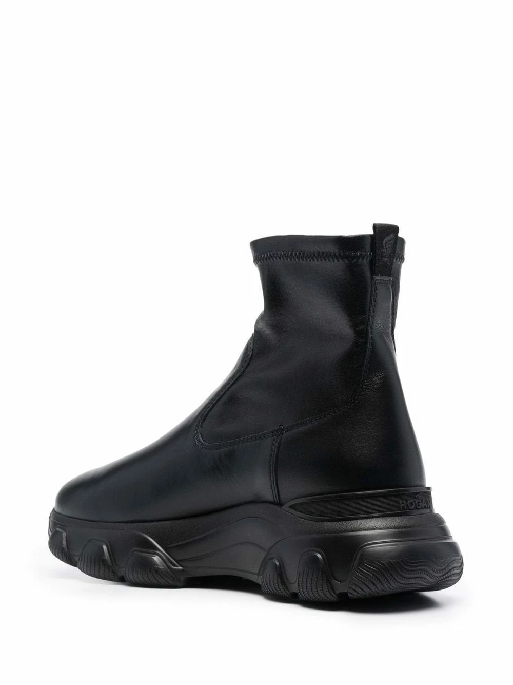 Design ton sur ton, bout rond, cheville style chaussette, semelle intérieure à logo, languette d’enfilage au talon, semelle épaisse. Couleur : noir. Matière : cuir.