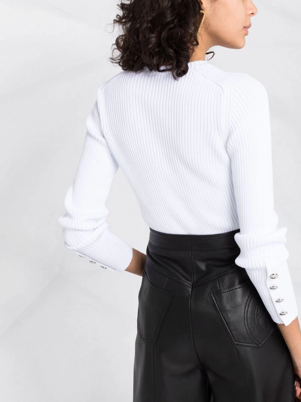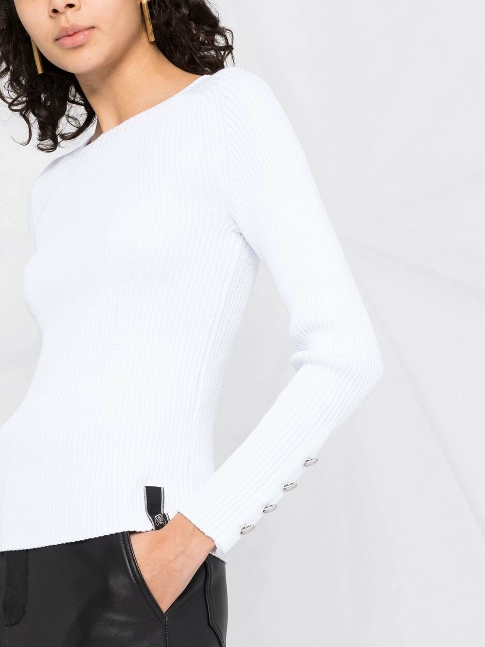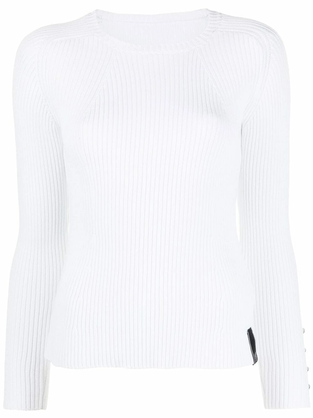 Maille nervurée, patch logo sur le devant, encolure ras du cou, poignets boutonnés, manches longues, ourlet droit. Couleur : blanc. Matière : coton.