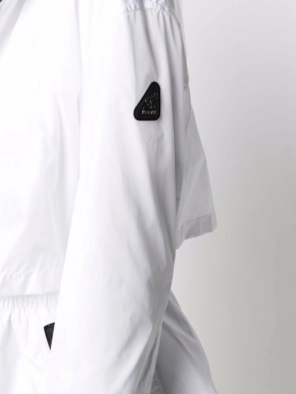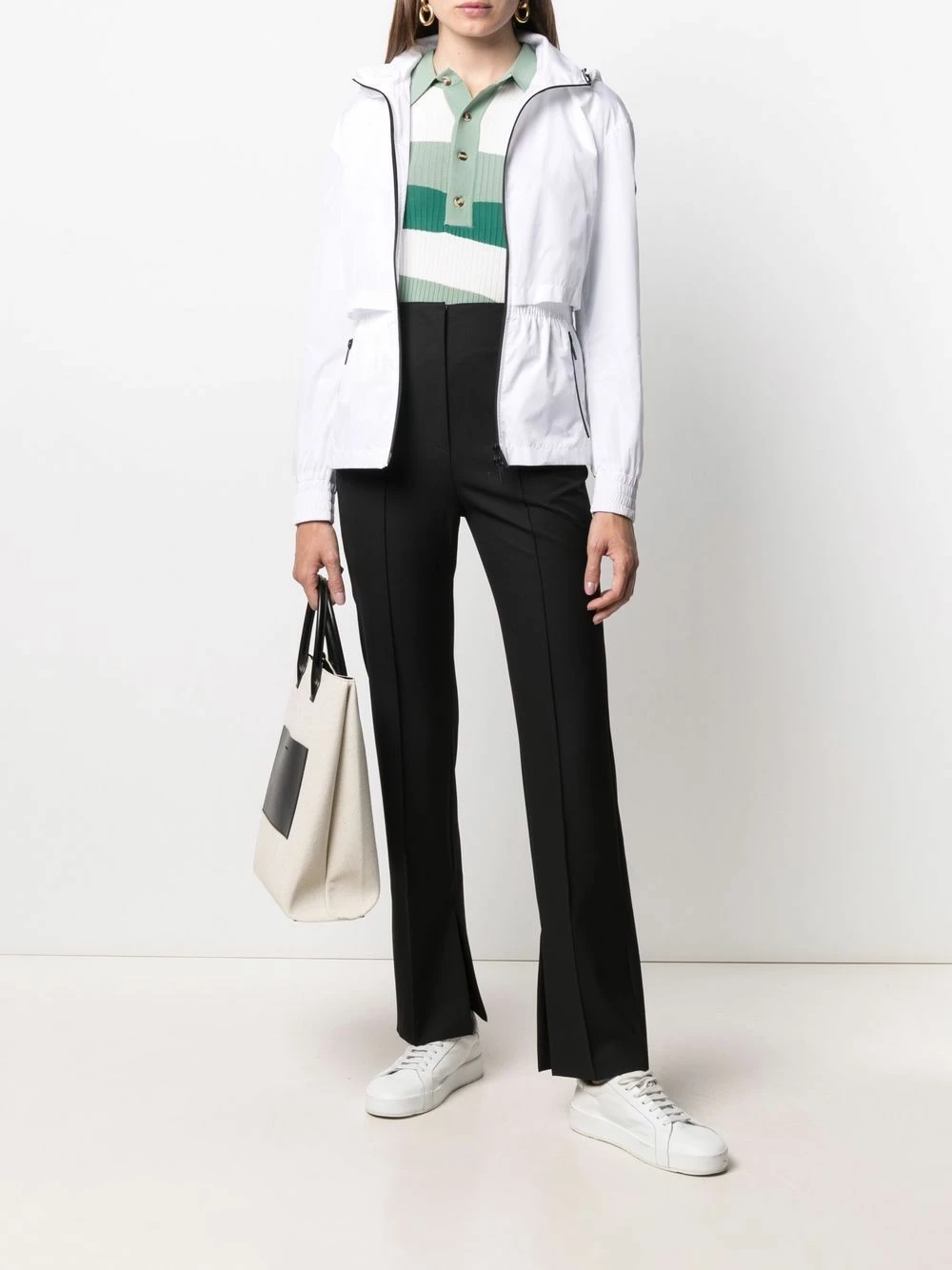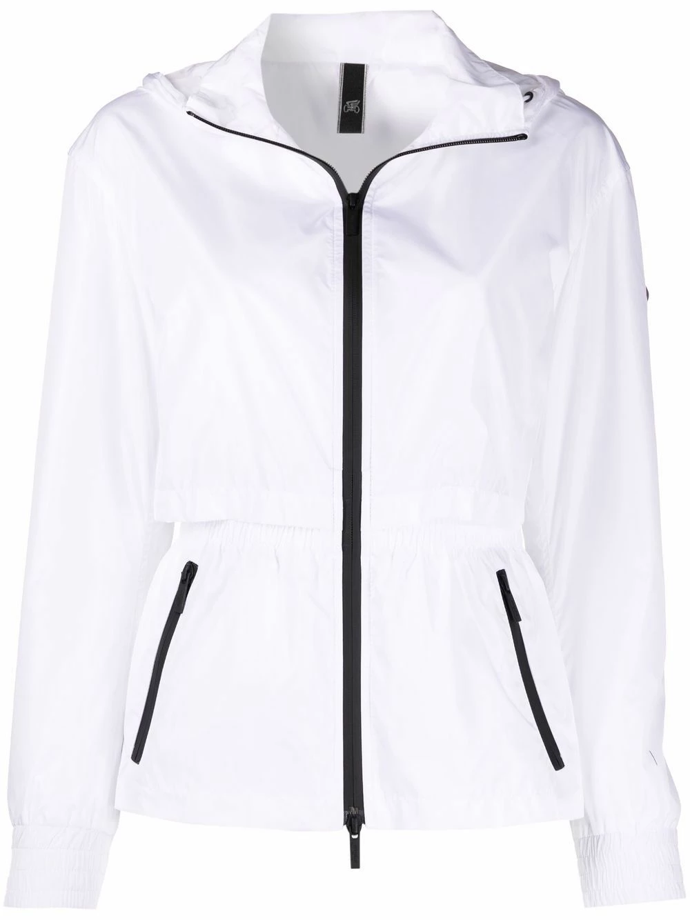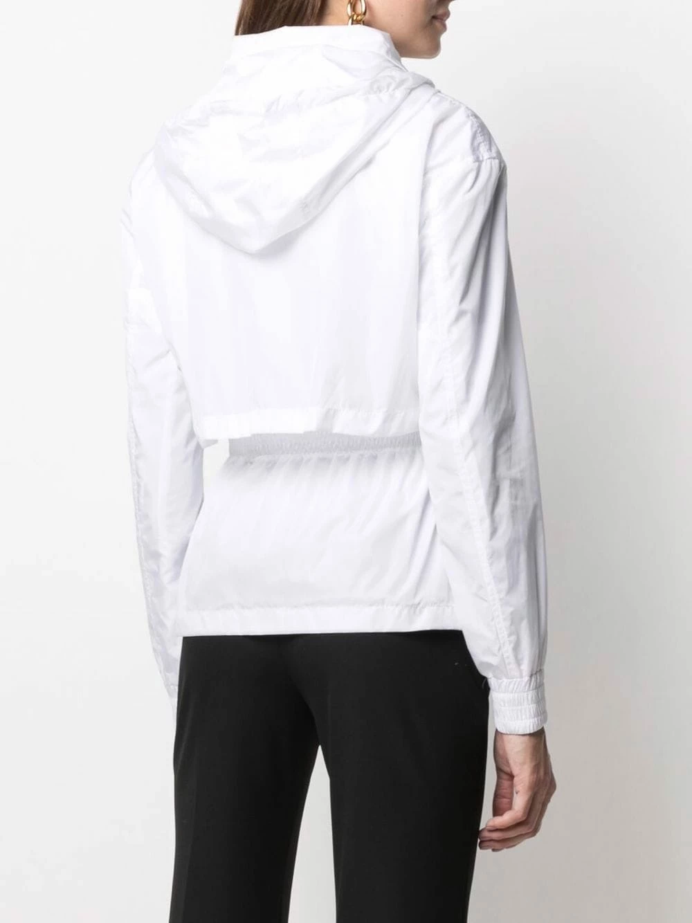 Effet superposé, col montant, capuche classique, fermeture zippée devant, ceinture élastique, manches longues, poignets élastiqués, deux poches latérales zippées, ourlet droit.