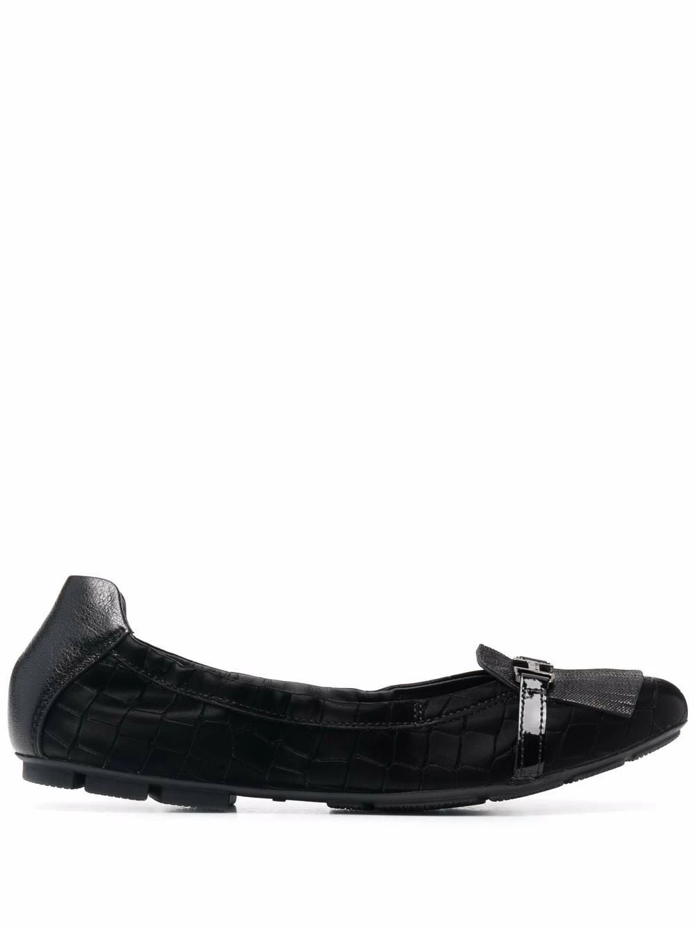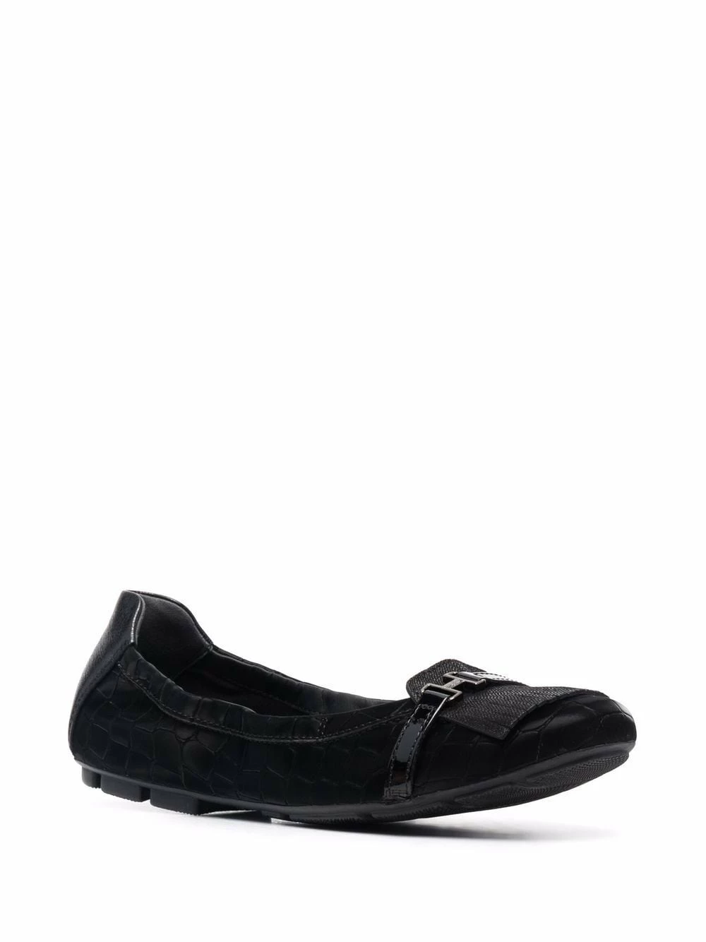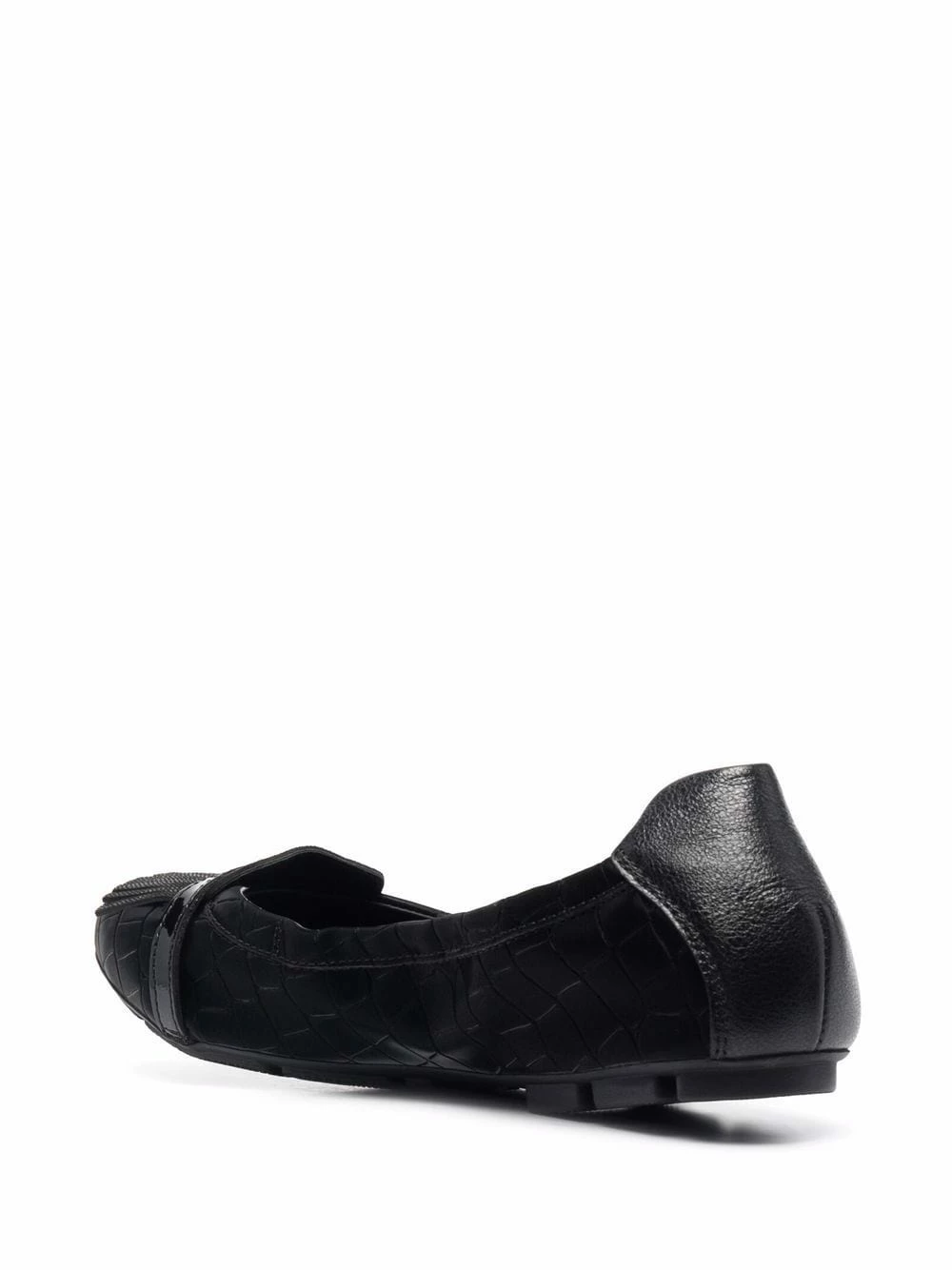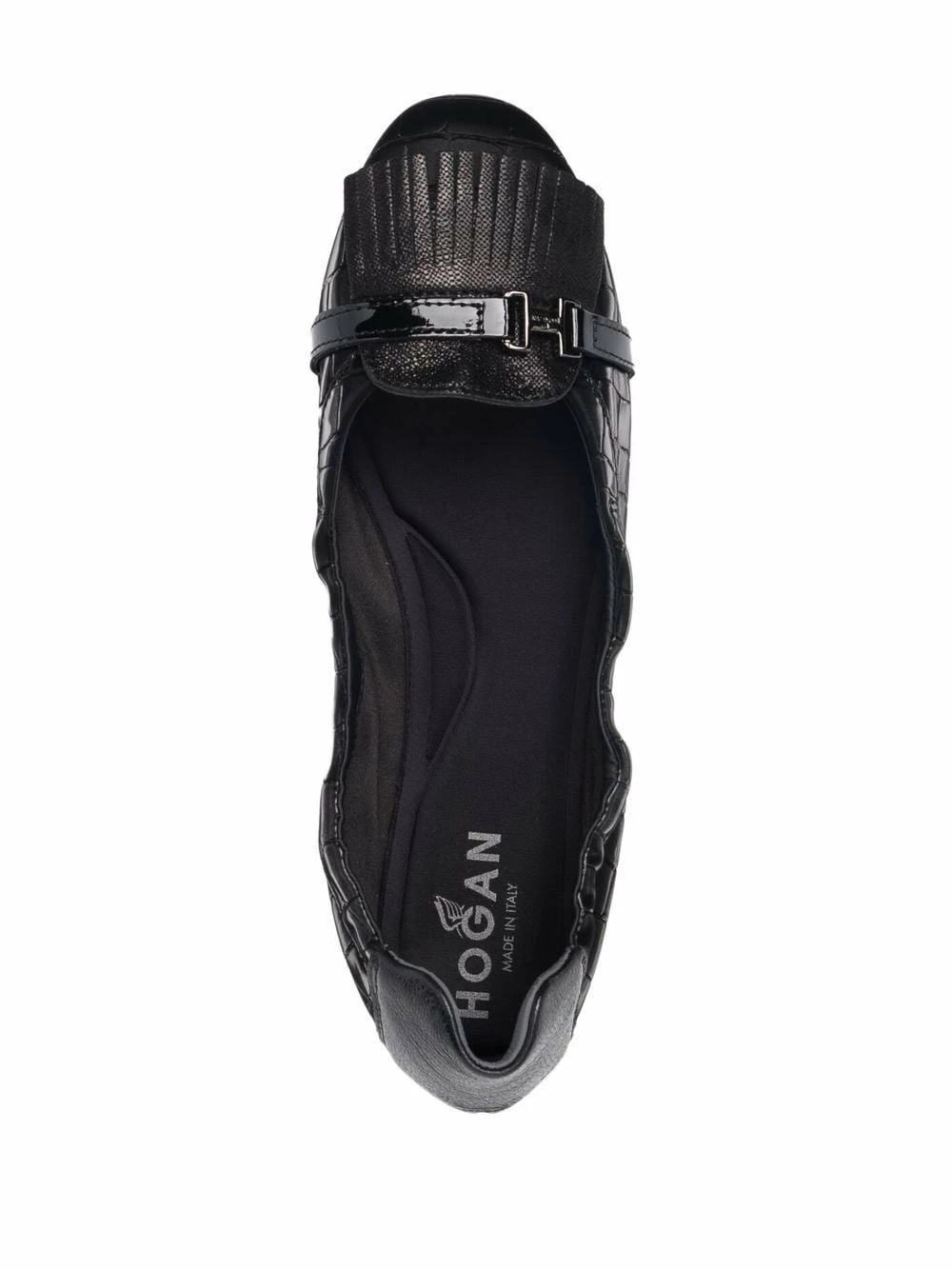 Effet peau de crocodile, finition à franges, bout rond, semelle intérieure à logo, semelle plate. Couleur : noir. Matière : cuir.