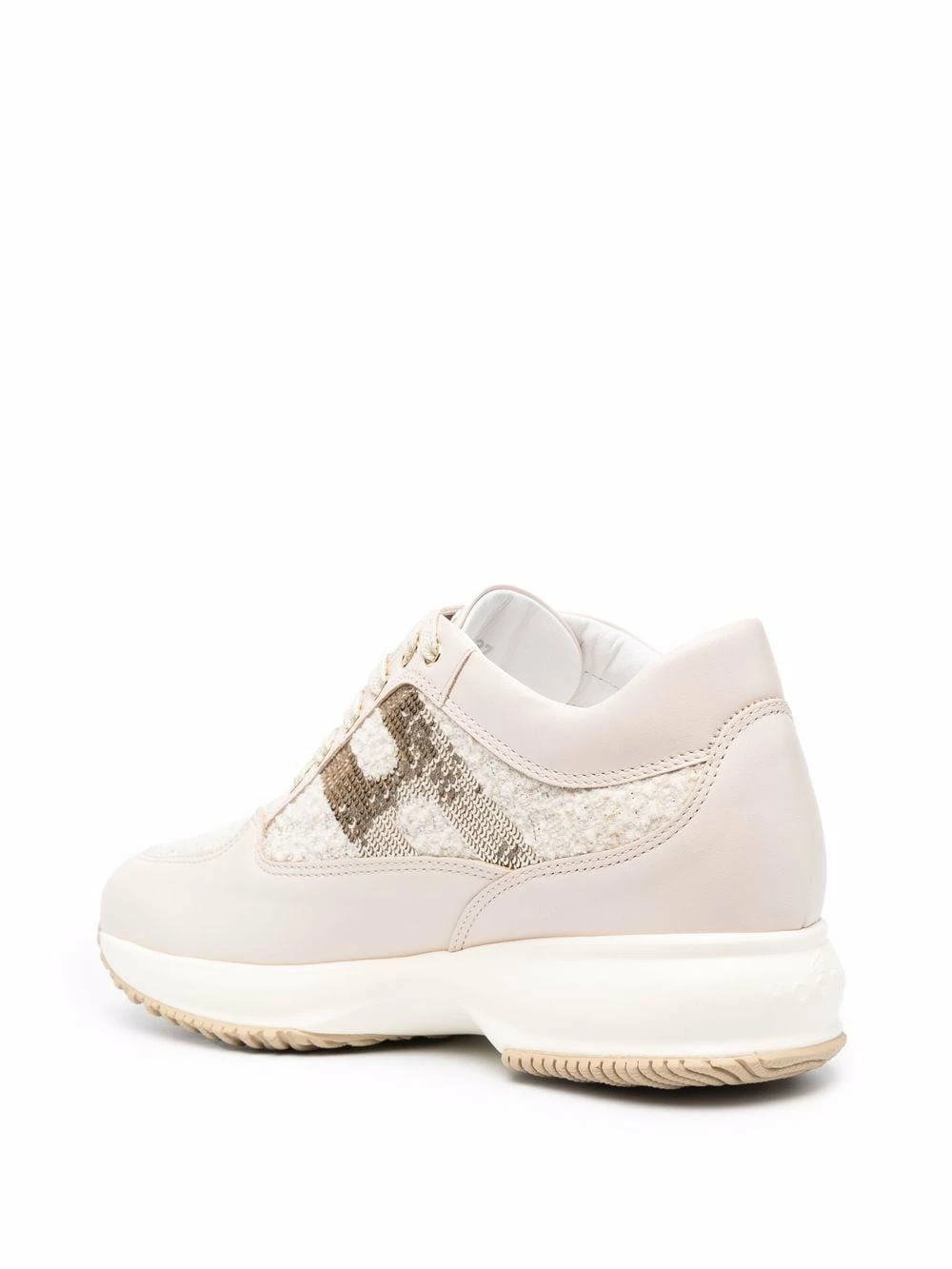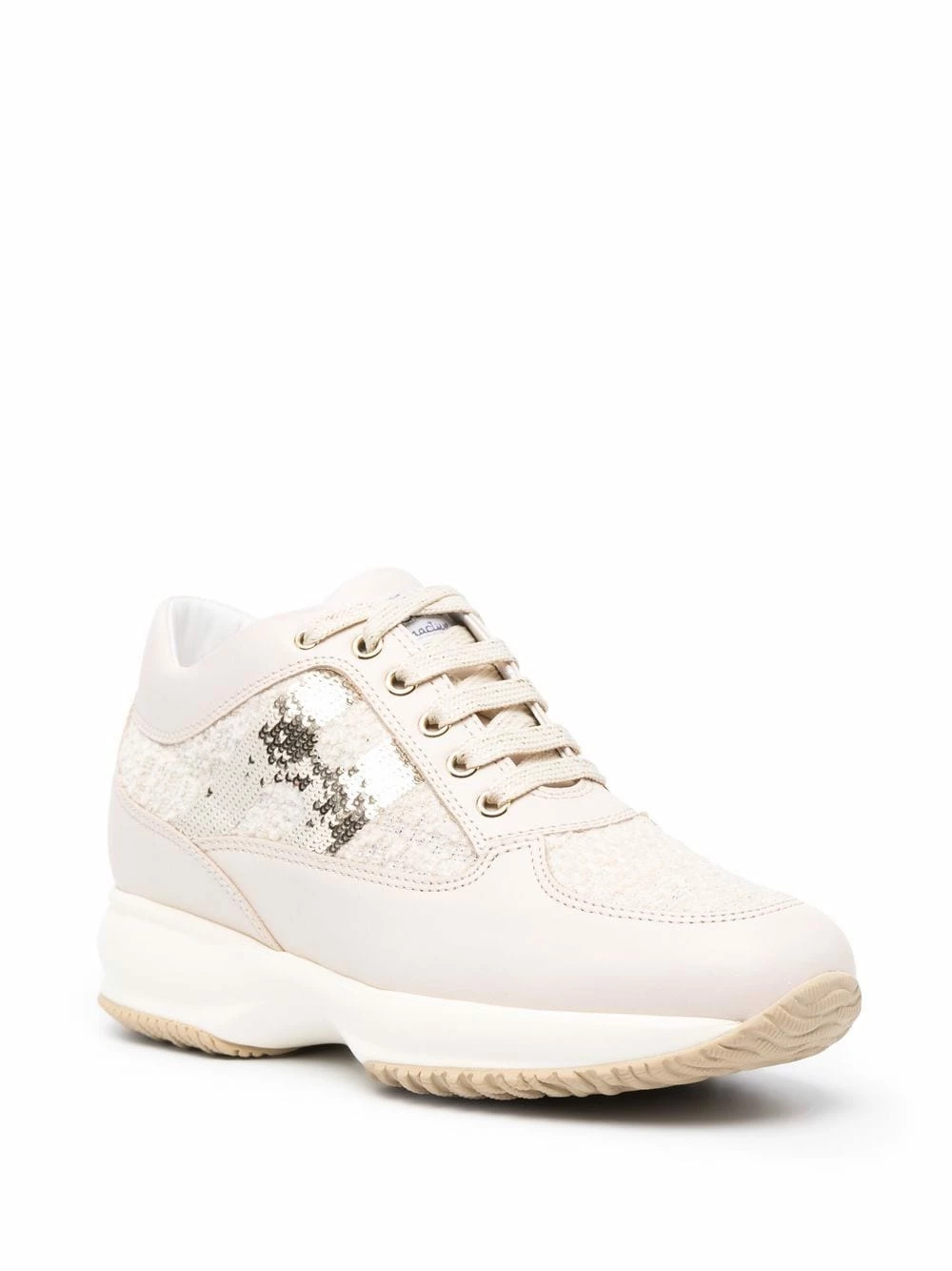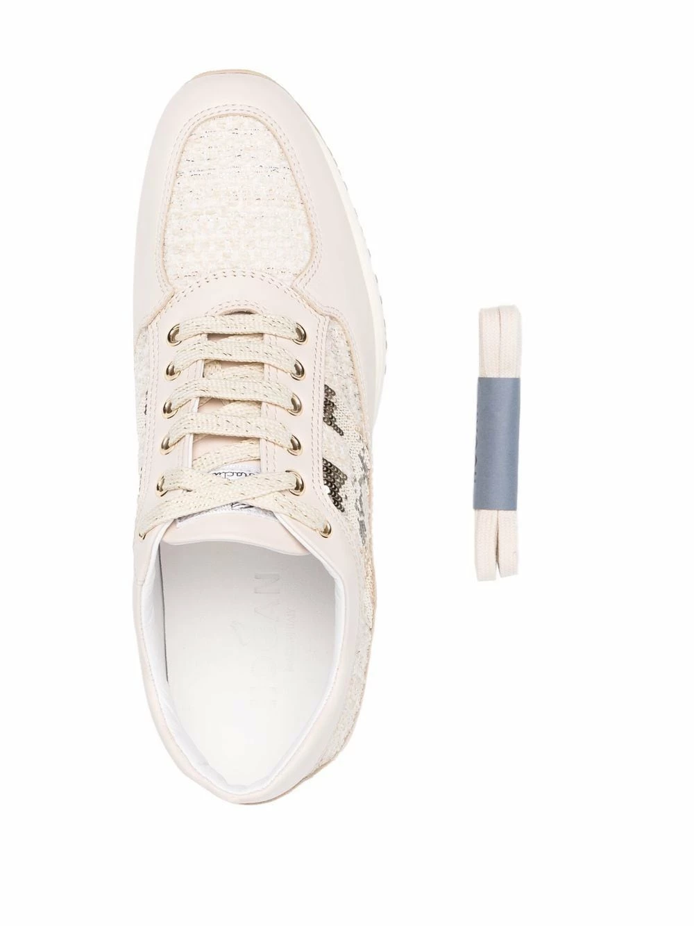 Design en fil bouclé, ornements en sequins, languette à patch logo, bout rond, fermeture à lacer sur le devant, semelle intérieure à logo, semelle crantée en caoutchouc. Matière : cuir.