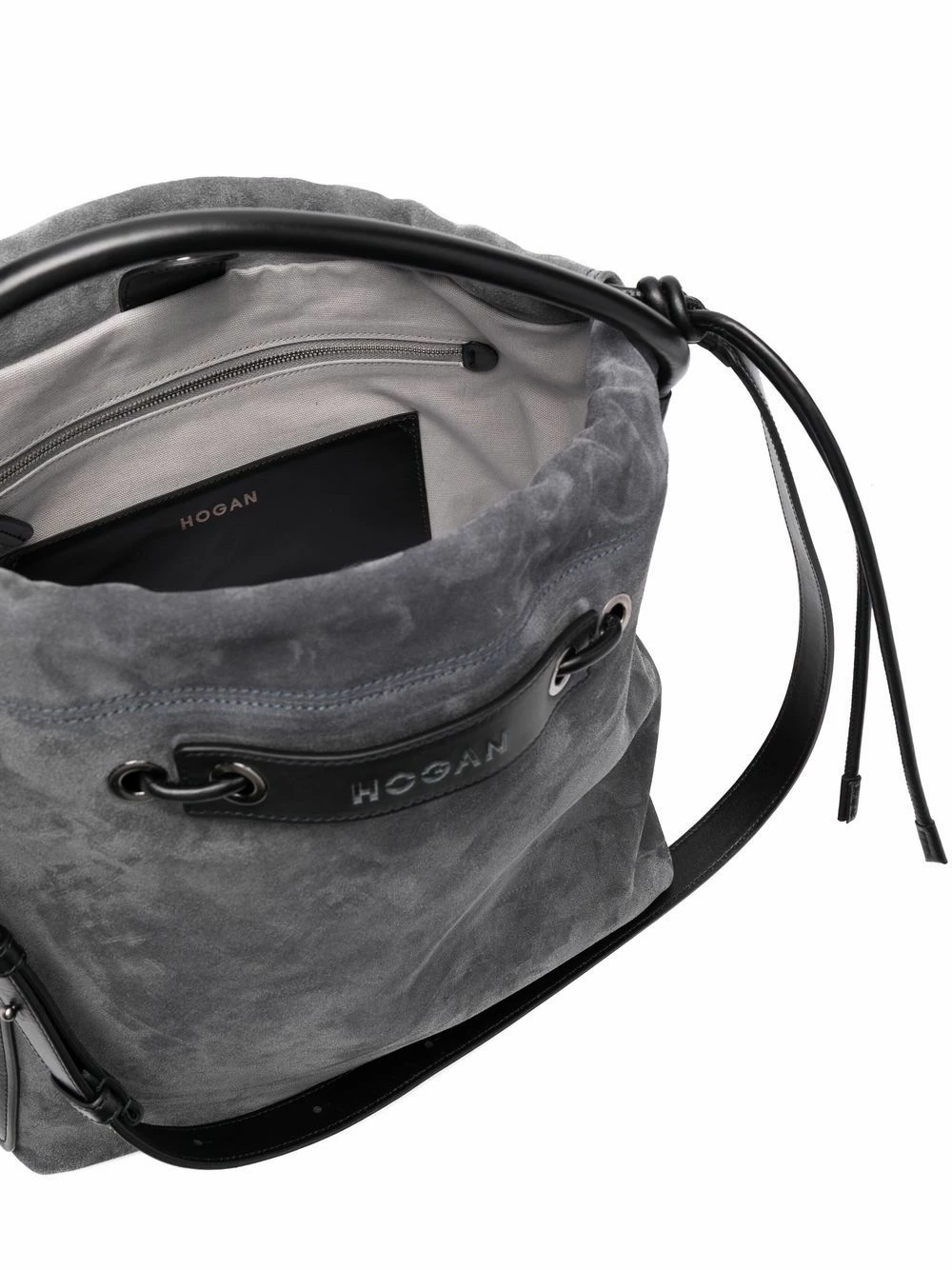 Fermeture à lien de resserrage, anse plate sur le dessus, bride porté épaule ajustable, poches intérieures zippées, doublure intégrale.